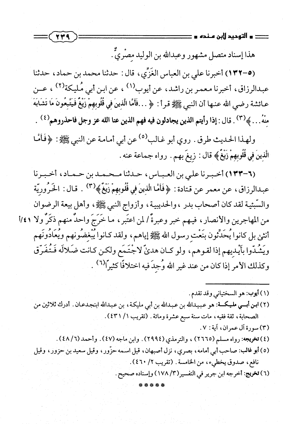 (٥ - ١٣٢) أخبرنا على بن العباس الغَزِّى، قال: حدثنا محمد بن حماد، حدثنا عبد الرزاق، أخبرنا معمر بن راشد، عن أيوب (¬١)، عن ابن أبى مُليكة (¬٢)، عن عائشة رضى الله عنها أن النبى صلّى الله عليه وسلم قرأ: { ... فَأَمَّا الَّذِينَ فِي قُلُوبِهِمْ زَيْغٌ فَيَتَّبِعُونَ ما تَشابَهَ مِنْهُ .. }. (¬٣). قال: إذا رأيتم الذين يجادلون فيه فهم الذين عنا الله عز وجل فاحذروهم (¬٤).