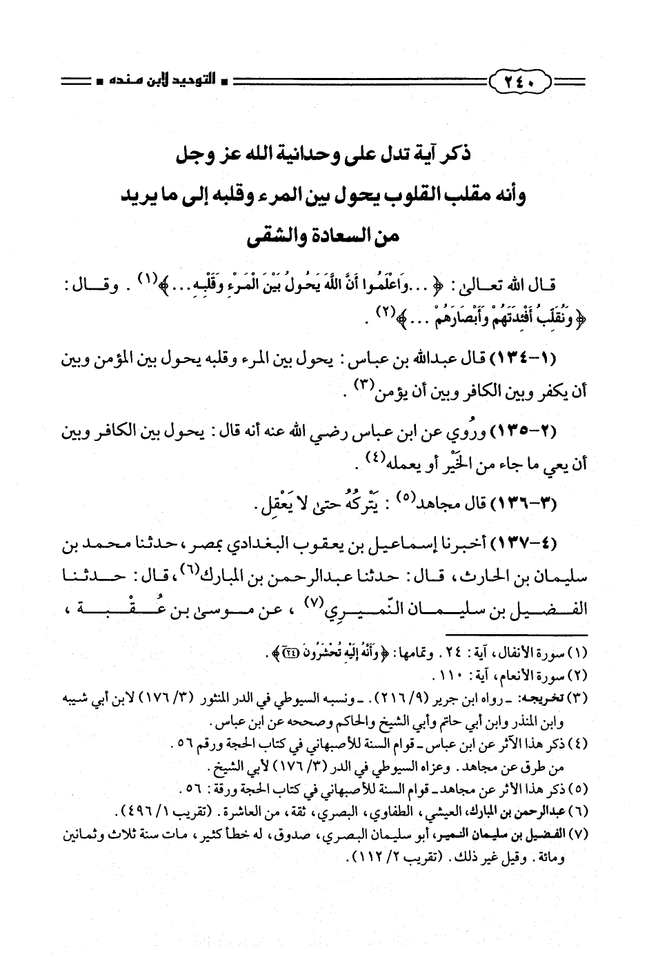 (١ - ١٣٤) قال عبد الله بن عباس: يحول بين المرء وقلبه يحول بين المؤمن وبين أن يكفر وبين الكافر وبين أن يؤمن (¬٣).