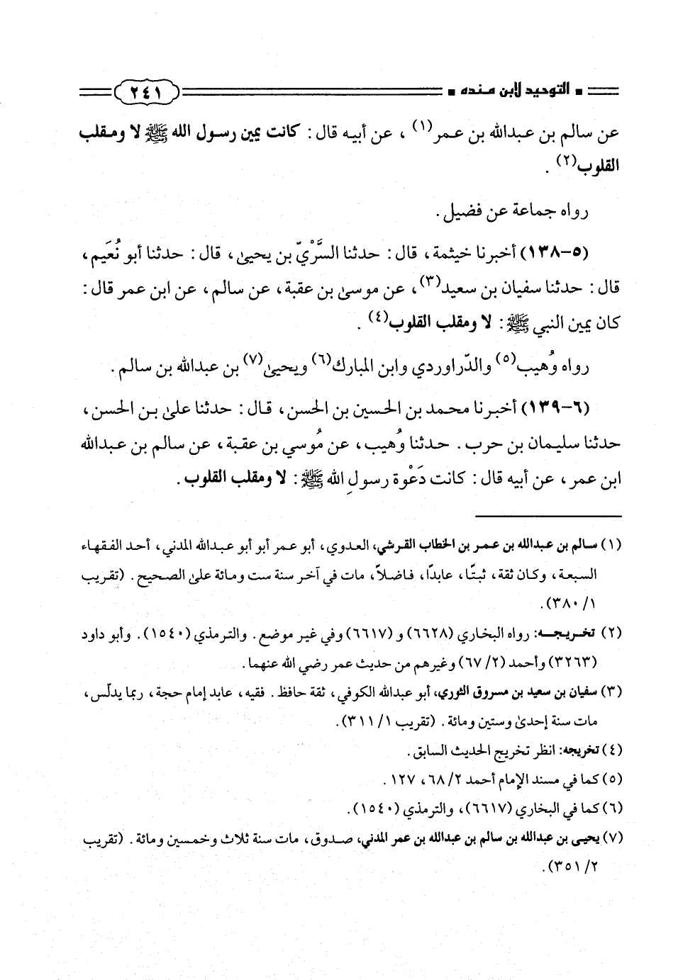 (¬١) سالم بن عبد الله بن عمر بن الخطاب القرشى، العدوى، أبو عمر أبو أبو عبد الله المدنى، أحد الفقهاء السبعة، وكان ثقة، ثبتاً، عابداً، فاضلاً، مات فى آخر سنة ست ومائة على الصحيح. (تقريب ٣٨٠/ ١).