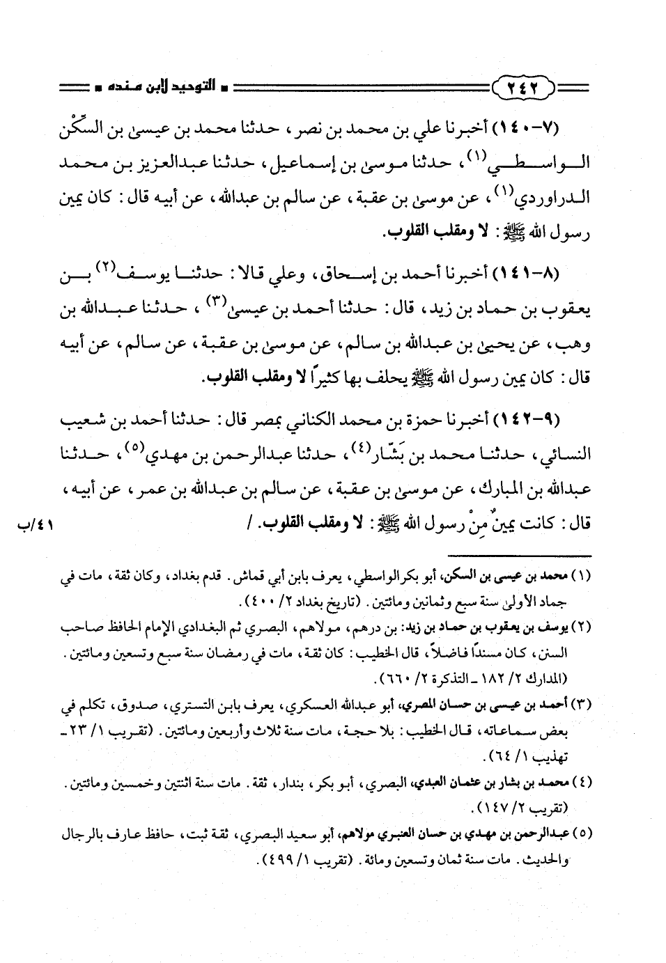 (٩ - ١٤٢) أخبرنا حمزة بن محمد الكنانى بمصر قال: حدثنا أحمد بن شعيب النسائى، حدثنا محمد بن بَشّار (¬٤)، حدثنا عبد الرحمن بن مهدى (¬٥)، حدثنا عبد الله بن المبارك، عن موسى بن عقبة، عن سالم بن عبد الله بن عمر، عن أبيه، قال: كانت يمين مِنْ رسول الله صلّى الله عليه وسلم: لا ومقلب القلوب. /