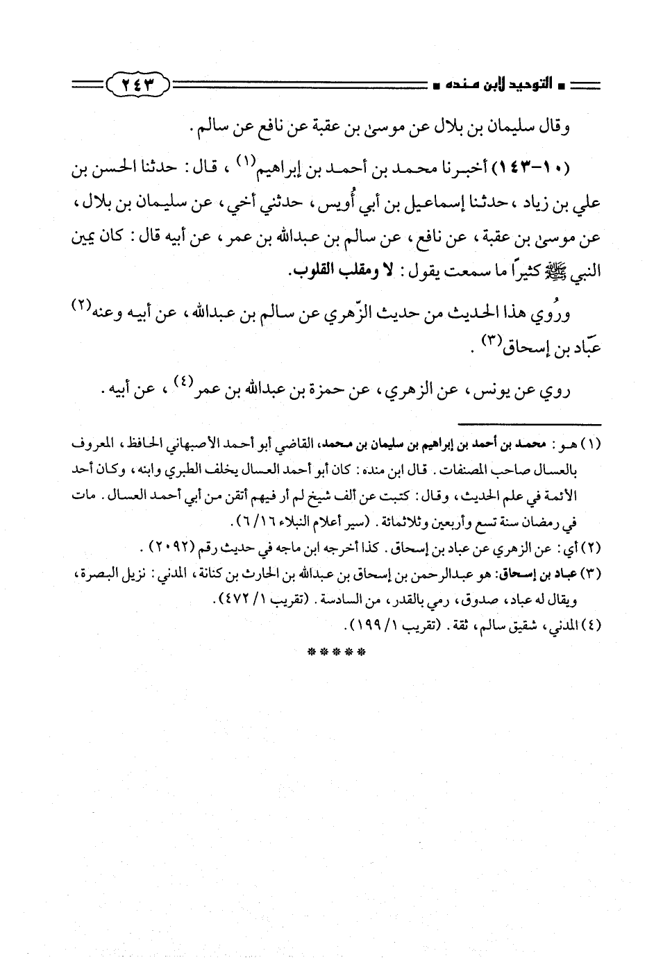 (١٠ - ١٤٣) أخبرنا محمد بن أحمد بن إبراهيم (¬١)، قال: حدثنا الحسن بن على بن زياد، حدثنا إسماعيل بن أبى أُويس، حدثنى أخى، عن سليمان بن بلال، عن موسى بن عقبة، عن نافع، عن سالم بن عبد الله بن عمر، عن أبيه قال: كان يمين النبى صلّى الله عليه وسلم كثيراً ما سمعت يقول: لا ومقلب القلوب.