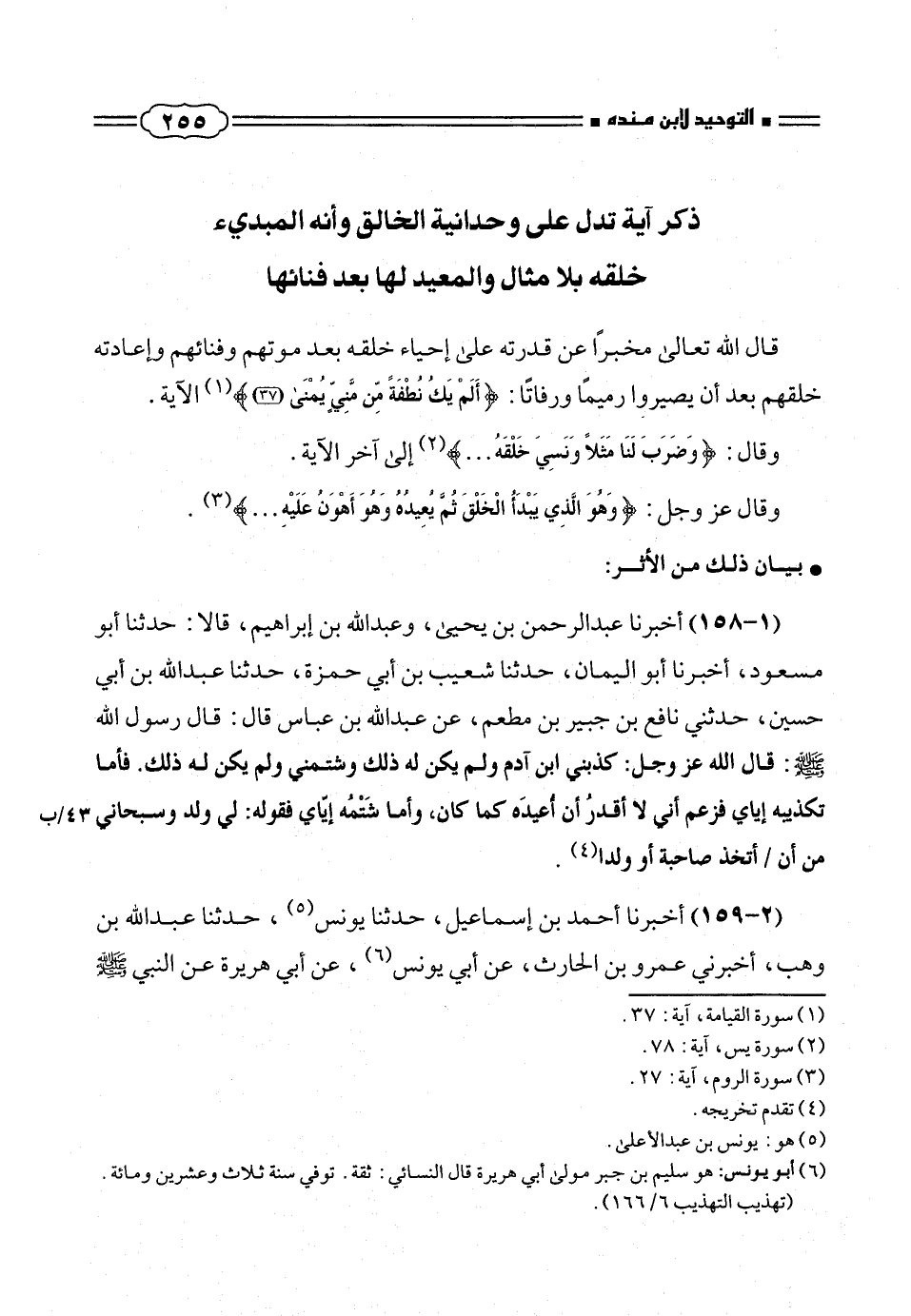 (١ - ١٥٨) أخبرنا عبد الرحمن بن يحيى، وعبدالله بن إبراهيم، قالا: حدثنا أبو مسعود، أخبرنا أبو اليمان، حدثنا شعيب بن أبى حمزة، حدثنا عبد الله بن أبى حسين، حدثنى نافع بن جبير بن مطعم، عن عبد الله بن عباس قال: قال رسول الله صلّى الله عليه وسلم: قال الله عز وجل: كذبنى ابن آدم ولم يكن له ذلك وشتمنى ولم يكن له ذلك. فأما تكذيبه إياى فزعم أنى لا أقدرُ أن أعيدَه كما كان، وأما شَتْمُه إيّاى فقوله: لى ولد وسبحانى ٤٣ /ب من أن/أتخذ صاحبة أو ولدا (¬٤).