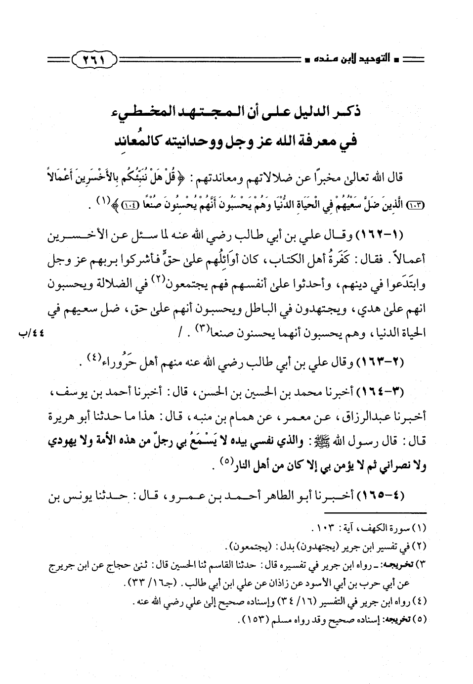 (٣ - ١٦٤) أخبرنا محمد بن الحسين بن الحسن، قال: أخبرنا أحمد بن يوسف، أخبرنا عبد الرزاق، عن معمر، عن همام بن منبه، قال: هذا ما حدثنا أبو هريرة قال: قال رسول الله صلّى الله عليه وسلم: والذى نفسى بيده لا يسْمَعُ بى رجل من هذه الأمة ولا يهودى ولا نصرانى ثم لا يؤمن بى إلا كان من أهل النار (¬٥).