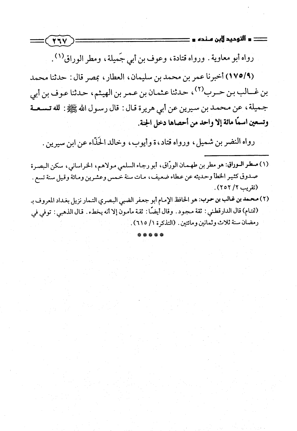 (١٧٥/ ٩) أخبرنا عمر بن محمد بن سليمان، العطار، بمصر قال: حدثنا محمد بن غالب بن حرب (¬٢)، حدثناعثمان بن عمر بن الهيثم، حدثنا عوف بن أبى جميلة، عن محمد بن سيرين عن أبى هريرة قال: قال رسول الله صلّى الله عليه وسلم: لله تسعة وتسعين اسما مائة إلا واحد من أحصاها دخل الجنة.