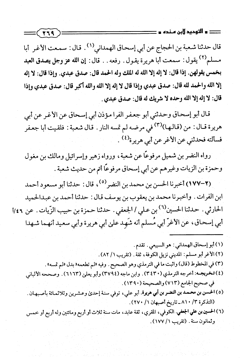 قال حدثنا شعبة بن الحجاج عن أبى إسحاق الهمدانى (¬١). قال: سمعت الأغر أبا مسلم (¬٢) يقول: سمعت أبا هريرة يقول. رفعه .. قال: إن الله عز وجل يصدق العبد بخمس يقولهن. إذا قال: لا إله إلا الله له الملك وله الحمد قال: صدق عبدى. وإذا قال: لا إله إلا الله والحمد لله قال: صدق عبدى وإذا قال لا إله إلا الله والله أكبر قال: صدق عبدى وإذا قال: لا إله إلا الله وحده لا شريك له قال: صدق عبدى.