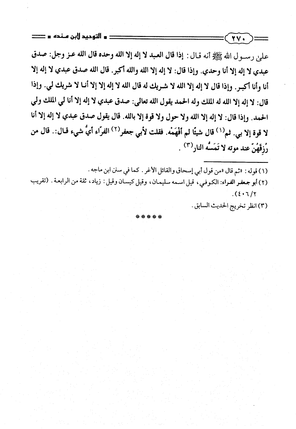 على رسول الله صلّى الله عليه وسلم أنه قال: إذا قال العبد لا إله إلا الله وحده قال الله عز وجل: صدق عبدى لا إله إلا أنا وحدى. وإذا قال: لا إله إلا الله والله أكبر. قال الله صدق عبدى لا إله إلا أنا وأنا اكبر. وإذا قال لا إله ألا الله لا شريك له قال الله لا إله إلا إلا أنا لا شريك لى. وإذا قال: لا إله إلا الله له الملك وله الحمد يقول الله تعالى: صدق عبدى لا إله إلا أنا لى الملك ولى الحمد. وإذا قال: لا إله إلا الله ولا حول ولا قوة إلا بالله. قال يقول صدق عبدى لا إله إلا أنا لا قوة إلا بى. ثم (¬١) قال شيئاً لم أفهَمْه. فقلت لأبى جعفر (¬٢) الفرّاء أىُّ شئ قال:. قال من رُزِقهُنّ عند موته لا تَمَسُّه النار (¬٣).