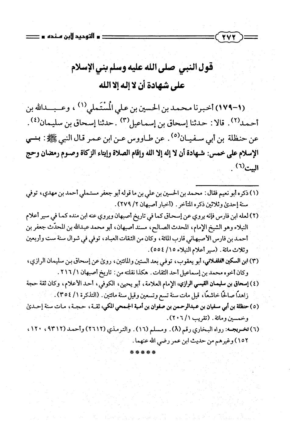 (¬٦) تخريجه: رواه البخارى رقم (٨). ومسلم (١٦). والترمذى (٢٦١٢) وأحمد (٩٣١٢، ١٢٠، ١٥٢) وغيرهم من حديث ابن عمر رضى الله عنهما.