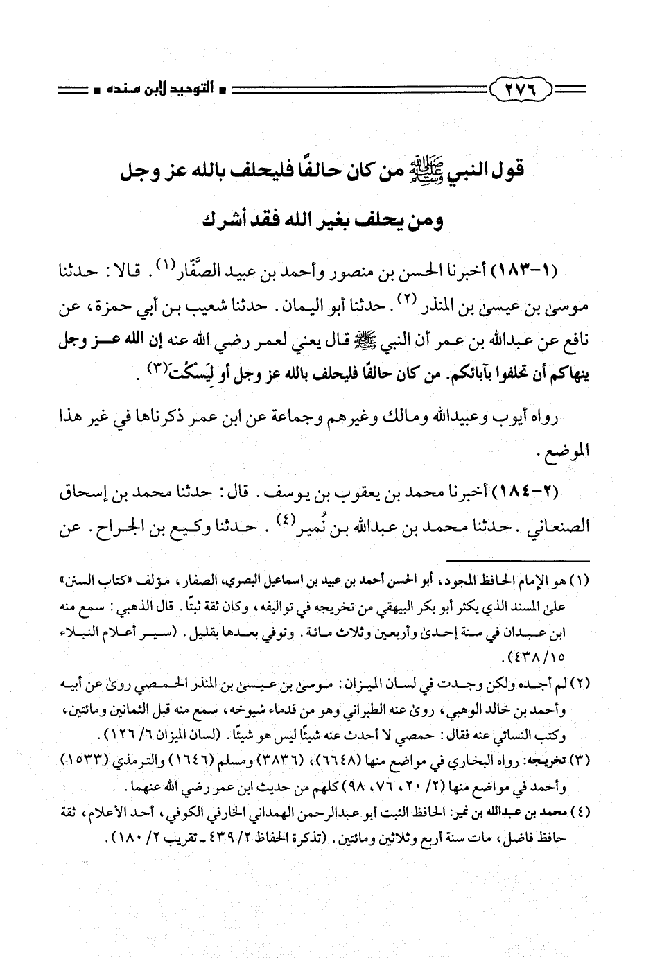 (١ - ١٨٣) أخبرنا الحسن بن منصور وأحمد بن عبيد الصَّفّار (¬١). قالا: حدثنا موسى بن عيسى بن المنذر (¬٢). حدثنا أبو اليمان. حدثنا شعيب بن أبى حمزة، عن نافع عن عبد الله بن عمر أن النبى صلّى الله عليه وسلم قال يعنى لعمر رضى الله عنه إن الله عز وجل ينهاكم أن تحلفوا بآبائكم. من كان حالفاً فليحلف بالله عز وجل أو لِيَسْكُتَ (¬٣).