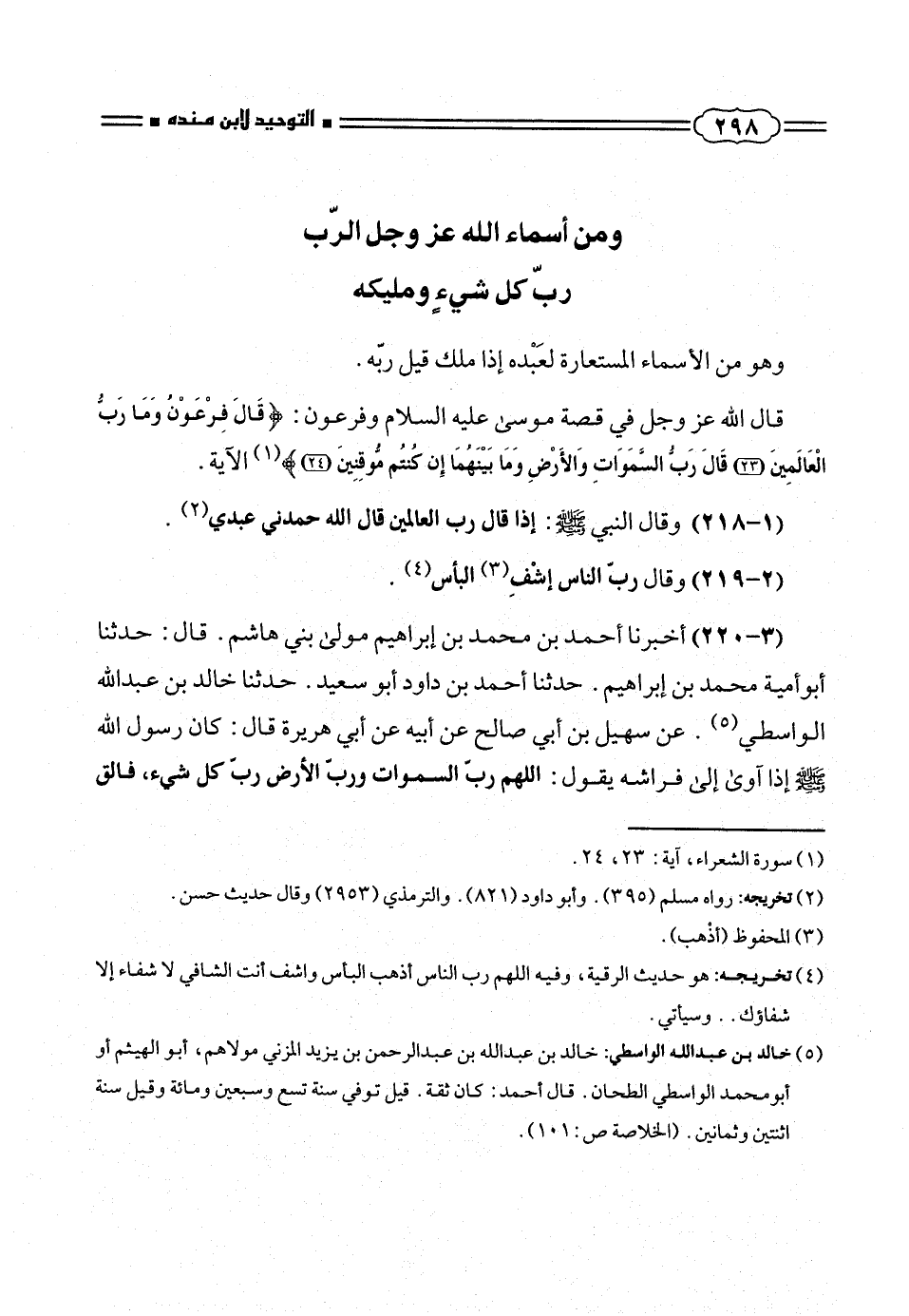 (¬٥) خالد بن عبد الله الواسطى: خالد بن عبد الله بن عبد الرحمن بن يزيد المزنى مولاهم، أبو الهيثم أو أبومحمد الواسطى الطحان. قال أحمد: كان ثقة. قيل توفى سنة تسع وسبعين ومائة وقيل سنة اثنتين وثمانين. (الخلاصة ص: ١٠١).