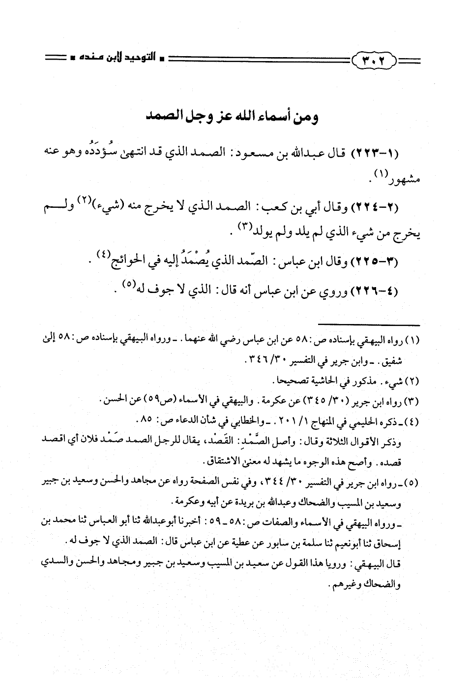 - ورواه البيهقى فى الأسماء والصفات ص: ٥٨ - ٥٩: أخبرنا أبوعبدالله ثنا أبو العباس ثنا محمد بن إسحاق ثنا أبونعيم ثنا سلمة بن سابور عن عطية عن ابن عباس قال: الصمد الذى لا جوف له.