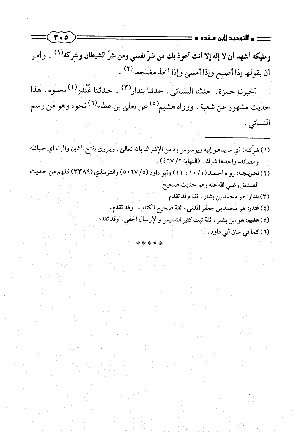 ومليكه أشهد أن لا إله إلا أنت أعوذ بك من شرّ نفسى ومن شرّ الشيطان وشِركه (¬١). وأمر أن يقولها إذا أصبح وإذا أمسى وإذا أخذ مضجعه (¬٢).