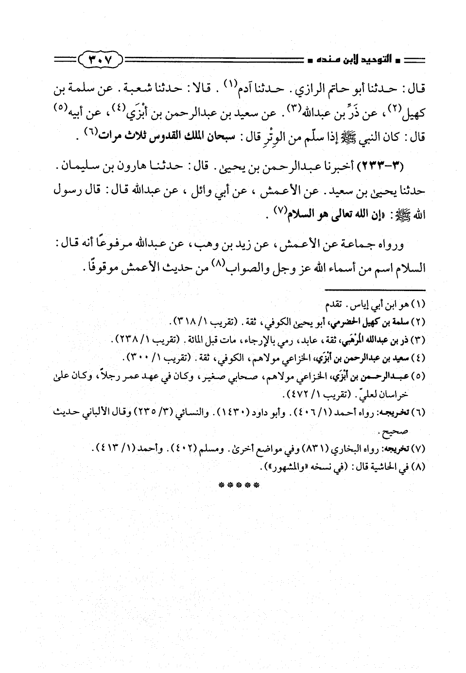 حدثنا يحيى بن سعيد. عن الأعمش، عن أبى وائل، عن عبد الله قال: قال رسول الله صلّى الله عليه وسلم: «إن الله تعالى هو السلام (¬٧).