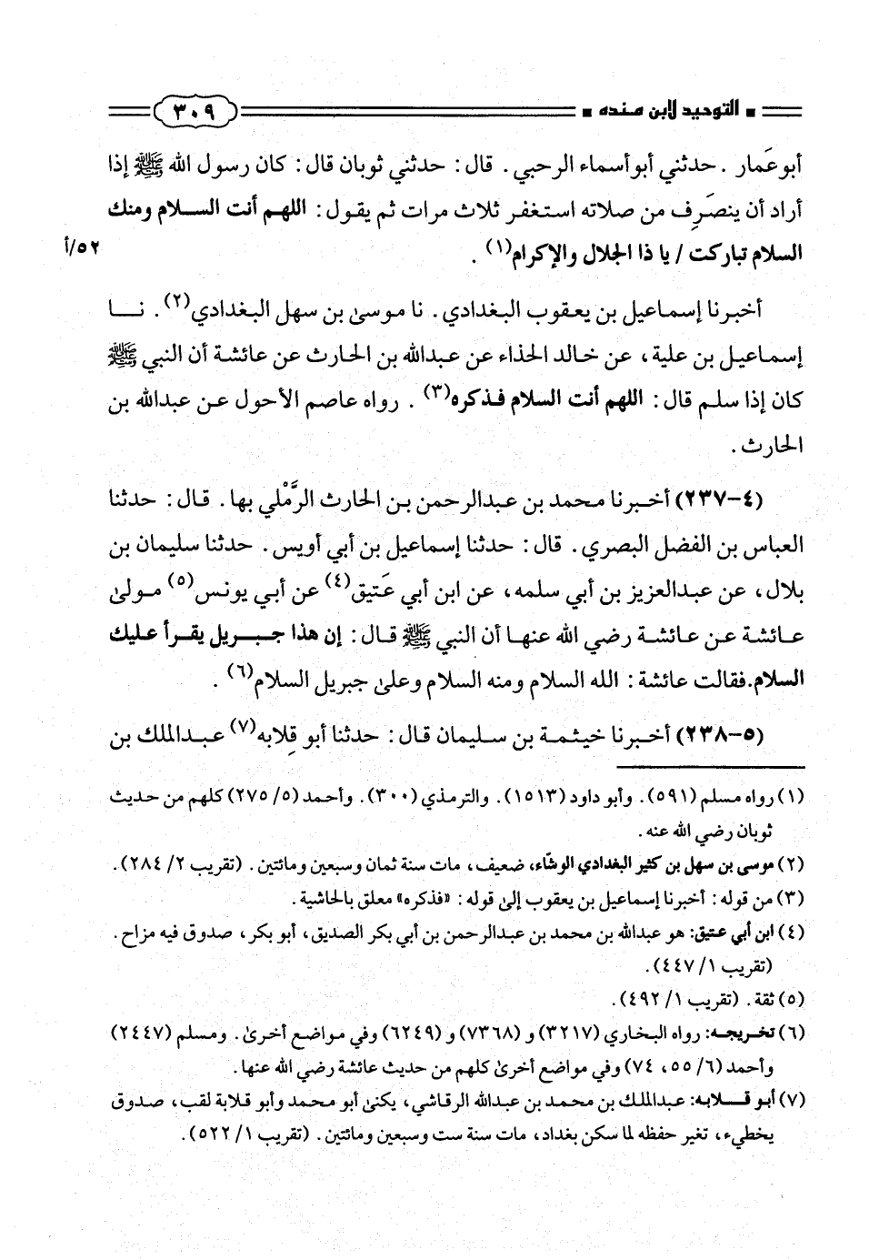 أبوعَمار. حدثنى أبوأسماء الرحبى. قال: حدثنى ثوبان قال: كان رسول الله صلّى الله عليه وسلم إذا أراد أن ينصَرِف من صلاته استغفر ثلاث مرات ثم يقول: اللهم أنت السلام ومنك السلام تباركت/يا ذا الجلال والإكرام (¬١).