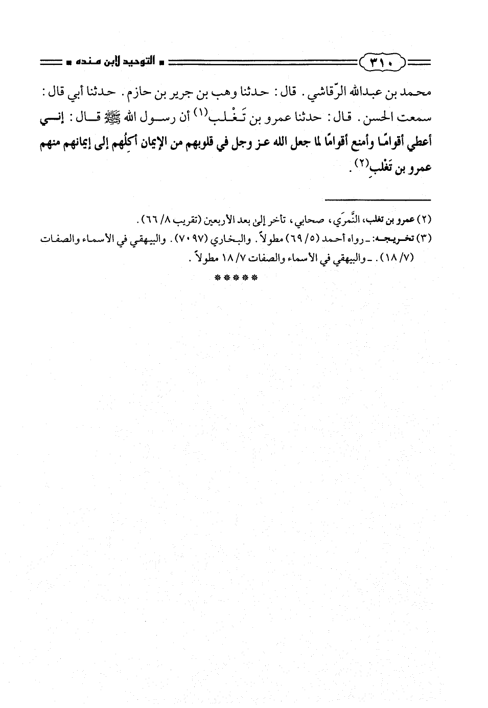 (¬١) عمرو بن تغلب، النَّمرَى، صحابى، تأخر إلى بعد الأربعين (تقريب ٦٦/ ٨).