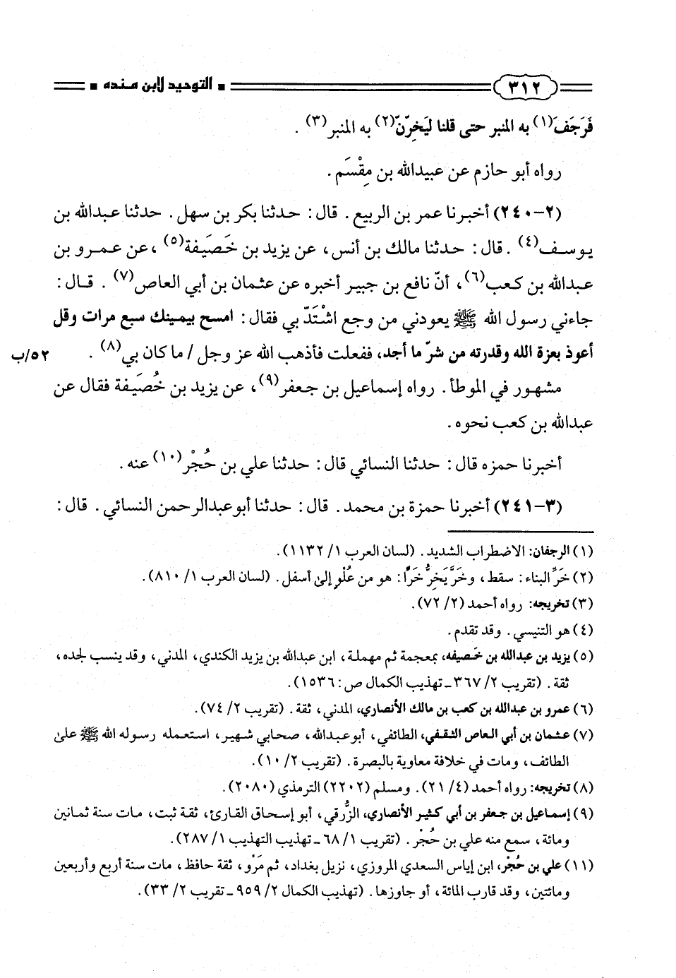 (٢ - ٢٤٠) أخبرنا عمر بن الربيع. قال: حدثنا بكر بن سهل. حدثنا عبد الله بن يوسف (¬٤). قال: حدثنا مالك بن أنس، عن يزيد بن خَصَيفة (¬٥)، عن عمرو بن عبد الله بن كعب (¬٦)، أنّ نافع بن جبير أخبره عن عثمان بن أبى العاص (¬٧). قال: