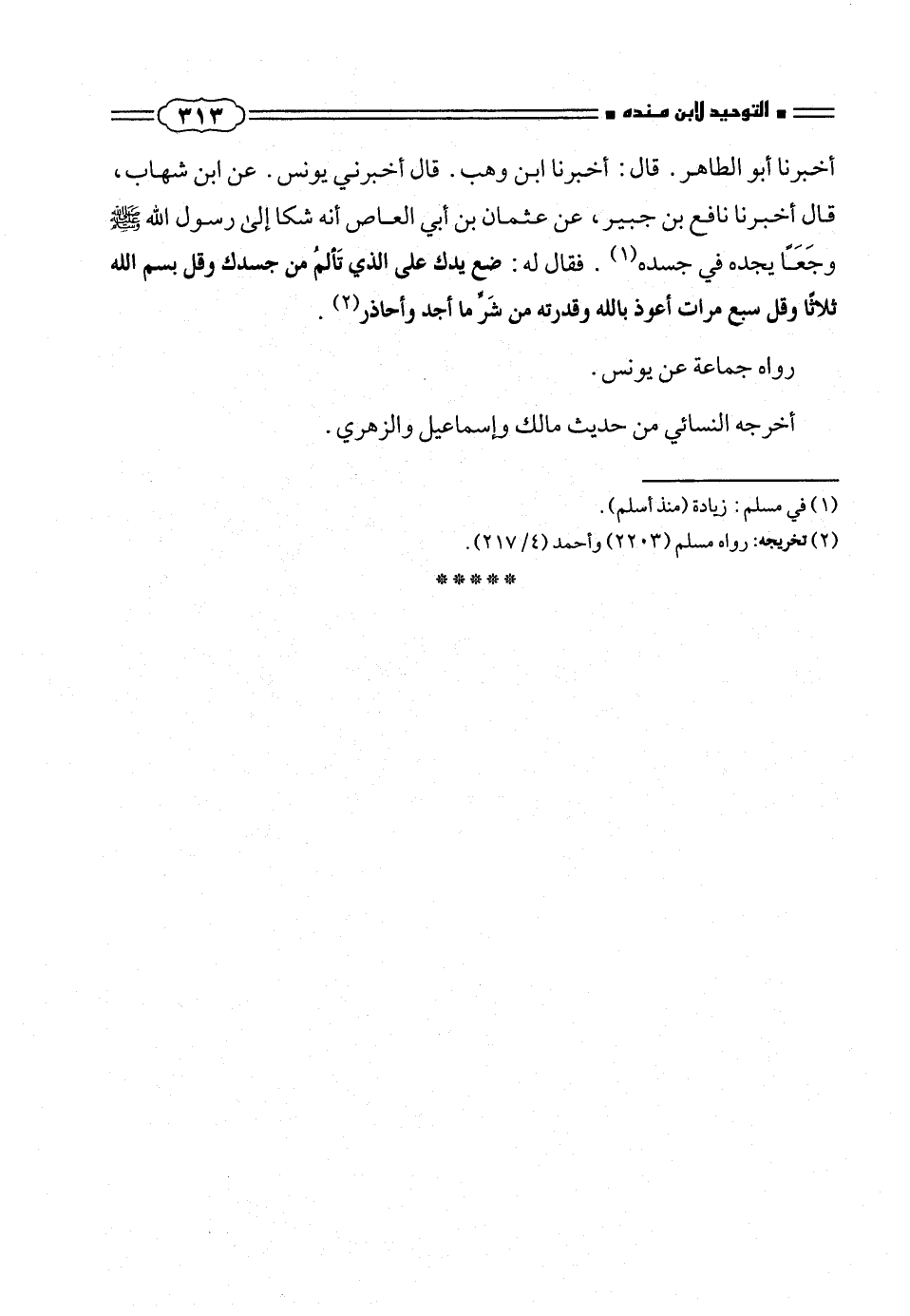 أخبرنا أبو الطاهر. قال: أخبرنا ابن وهب. قال أخبرنى يونس. عن ابن شهاب، قال أخبرنا نافع بن جبير، عن عثمان بن أبى العاص أنه شكا إلى رسول الله صلّى الله عليه وسلم وجَعاً يجده فى جسده (¬١). فقال له: ضع يدك على الذى تَألمُ من جسدك وقل بسم الله ثلاثاً وقل سبع مرات أعوذ بالله وقدرته من شرِّ ما أجد وأحاذر (¬٢).