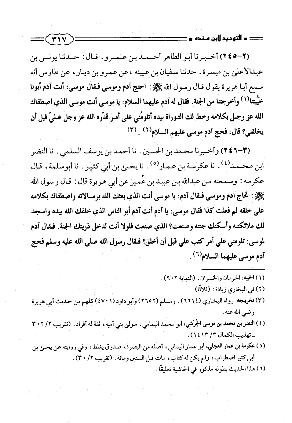 (٣ - ٢٤٦) وأخبرنا محمد بن الحسين. نا أحمد بن يوسف السلمى. نا النضر ابن محمد (¬٤). نا عكرمة بن عمار (¬٥). نا يحيى بن أبى كثير. نا أبوسلمة، قال عكرمه: وسمعته من عبد الله بن عبيد بن عميرعن أبى هريرة قال: قال رسول الله صلّى الله عليه وسلم: تحاج آدم وموسى فقال آدم: يا موسى أنت الذى بعثك الله برسالاته واصطفاك بكلامه على خلقه لم فعلت كذا فقال موسى: يا آدم أنت آدم أبو النالس الذى خلقك الله بيده واسجد لك ملائكته وأسكنك جنته وصنعت؟ الذى صنعت فلولا أنت لدخل ذريتك الجنة. فقال آدم لموسى: تلومنى على أمر كتب على قبل أن أخلق؟ فقال رسول الله صلى الله عليه وسلم فحج آدم موسى عليهما السلام (¬٦).