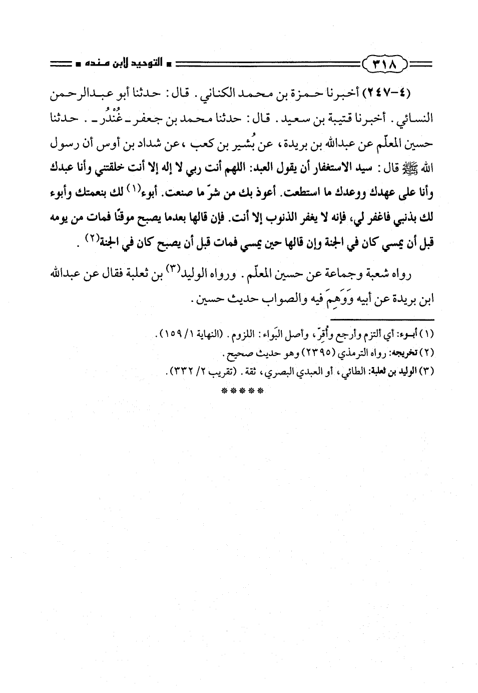 (٤ - ٢٤٧) أخبرنا حمزة بن محمد الكنانى. قال: حدثنا أبو عبد الرحمن النسائى. أخبرنا قتيبة بن سعيد. قال: حدثنا محمد بن جعفر - غُنْدُر -. حدثنا حسين المعلّم عن عبد الله بن بريدة، عن بُشير بن كعب، عن شداد بن أوس أن رسول الله صلّى الله عليه وسلم قال: سيد الاستغفار أن يقول العبد: اللهم أنت ربى لا إله إلا أنت خلقتنى وأنا عبدك وأنا على عهدك ووعدك ما استطعت. أعوذ بك من شرّ ما صنعت. أبوء (¬١) لك بنعمتك وأبوء لك بذنبى فاغفر لى، فإنه لا يغفر الذنوب إلا أنت. فإن قالها بعدما يصبح موقناً فمات من يومه قبل أن يمسى كان فى الجنة وإن قالها حين يمسى فمات قبل أن يصبح كان فى الجنة (¬٢).
