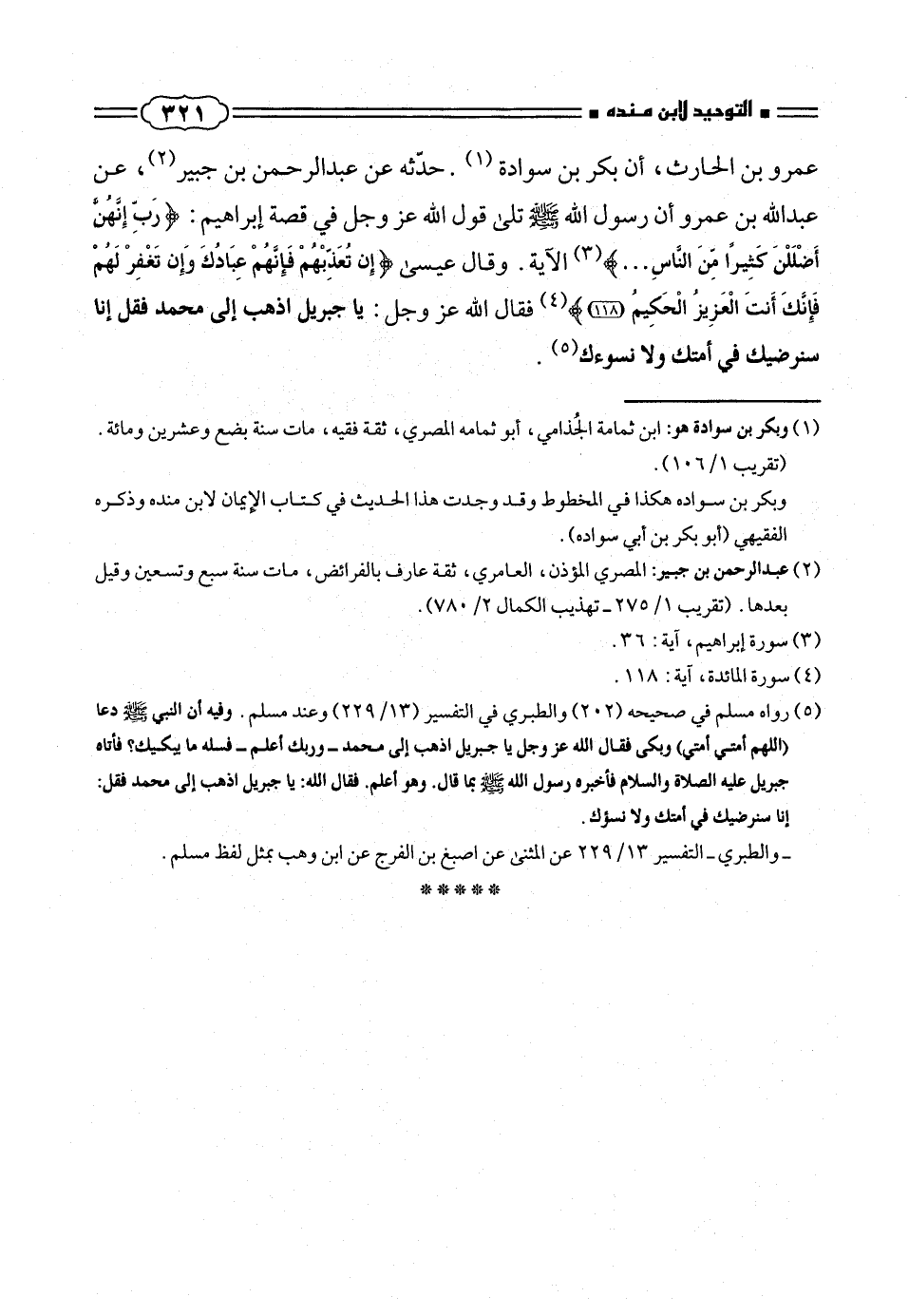 (¬٥) رواه مسلم فى صحيحه (٢٠٢) والطبرى فى التفسير (٢٢٩/ ١٣) وعند مسلم. وفيه أن النبى صلّى الله عليه وسلم دعا (اللهم أمتى أمتى) وبكى فقال الله عز وجل يا جبريل اذهب إلى محمد - وربك أعلم - فسله ما بيكيك؟ فأتاه جبريل عليه الصلاة والسلام فأخبره رسول الله صلّى الله عليه وسلم بما قال. وهو اعلم. فقال الله: يا جبريل اذمب إلى محمد فقل: