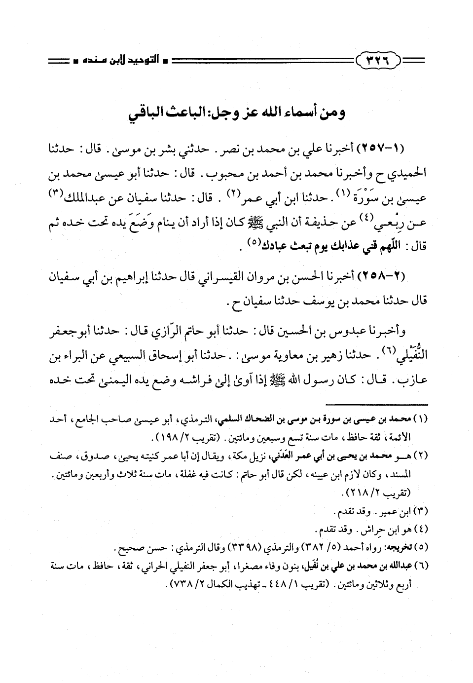 (١ - ٢٥٧) أخبرنا على بن محمد بن نصر. حدثنى بشر بن موسى. قال: حدثنا الحميدى ح وأخبرنا محمد بن أحمد بن محبوب. قال: حدثنا أبو عيسى محمد بن عيسى بن سَوْرَة (¬١). حدثنا ابن أبى عمر (¬٢). قال: حدثنا سفيان عن عبد الملك (¬٣) عن رِبْعى (¬٤) عن حذيفة أن النبى صلّى الله عليه وسلم كان إذا أراد أن ينام وَضَعَ يده تحت خده ثم قال: اللهم قنى عذابك يوم تبعث عبادك (¬٥).