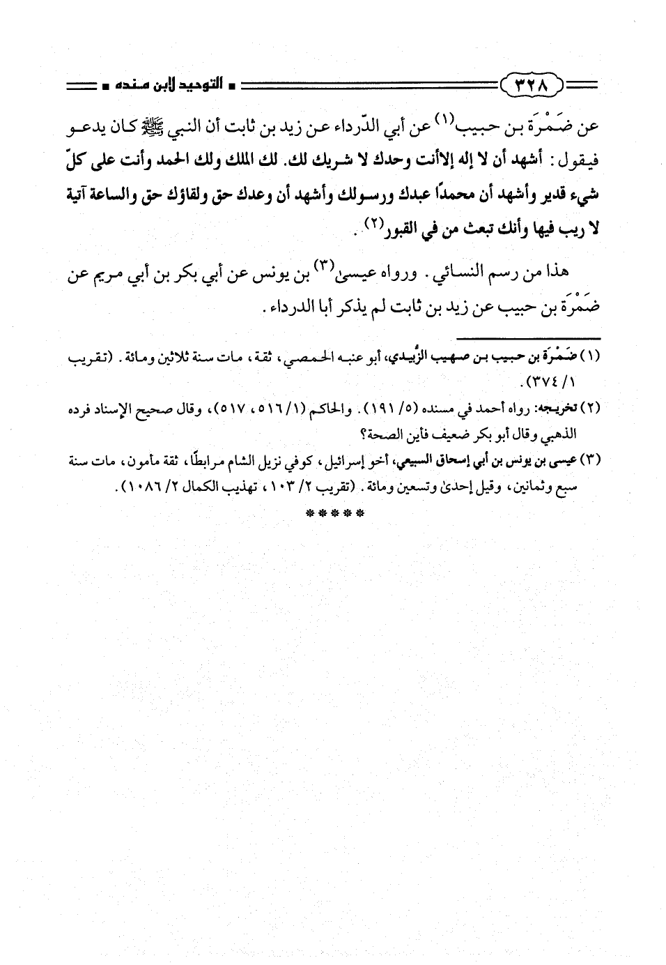 عن ضَمْرَة بن حبيب (¬١) عن أبى الدّرداء عن زيد بن ثابت أن النبى صلّى الله عليه وسلم كان يدعو فيقول: أشهد أن لا إله إلاأنت وحدك لا شريك لك. لك الملك ولك الحمد وأنت على كلّ شئ قدير وأشهد أن محمداً عبدك ورسولك وأشهد أن وعدك حق ولقاؤك حق والساعة آتية لا ريب فيها وأنك تبعث من فى القبور (¬٢).