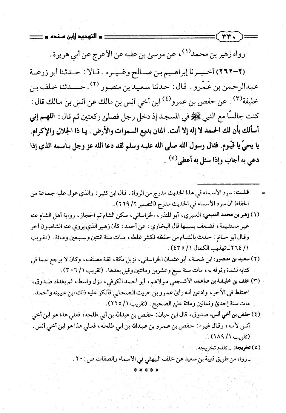 كنت جالساً مع النبى صلّى الله عليه وسلم فى المسجد إذ دخل رجل فصلى ركعتين ثم قال: اللهم إنى أسألك بأن لك الحمد لا إله إلا أنت. المنان بديع السموات والأرض. يا ذا الجلال والإكرام.