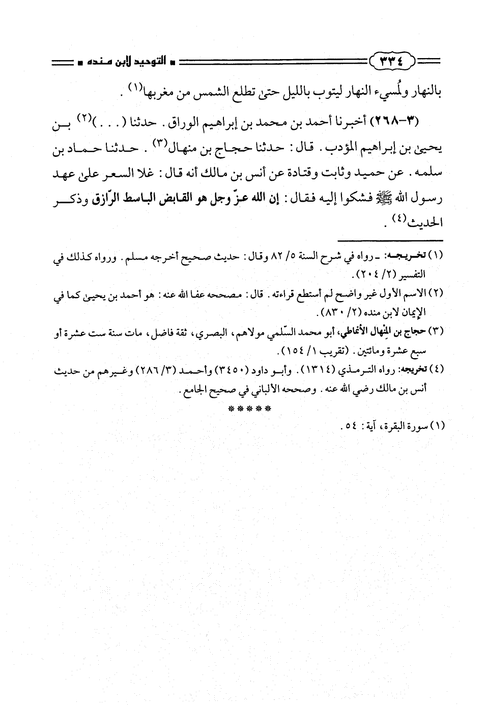 (٣ - ٢٦٨) أخبرنا أحمد بن محمد بن إبراهيم الوراق. حدثنا ( ... ) (¬٢) بن يحيى بن إبراهيم المؤدب. قال: حدثنا حجاج بن منهال (¬٣). حدثنا حماد بن سلمه. عن حميد وثابت وقتادة عن أنس بن مالك أنه قال: غلا السعر على عهد رسول الله صلّى الله عليه وسلم فشكوا إليه فقال: إن الله عز وجل هو القابض الباسط الرازق وذكر الحديث (¬٤).