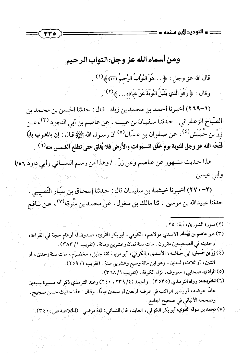 (١ - ٢٦٩) أخبرنا أحمد بن محمد بن زياد. قال: حدثنا الحسن بن محمد بن الصّباح الزعفرانى. حدثنا سفيان بن عيينه. عن عاصم بن أبى النجود (¬٣)، عن رِرّ بن حُبَيْش (¬٤)، عن صفوان بن عسّال (¬٥) أن رسول الله صلّى الله عليه وسلم قال: إن بالمغرب باباً فَتَحَه الله عز وجل للتوبة يوم خَلَق السموات والأرض فلا يغلق حتى تطلع الشمس منه (¬٦).
