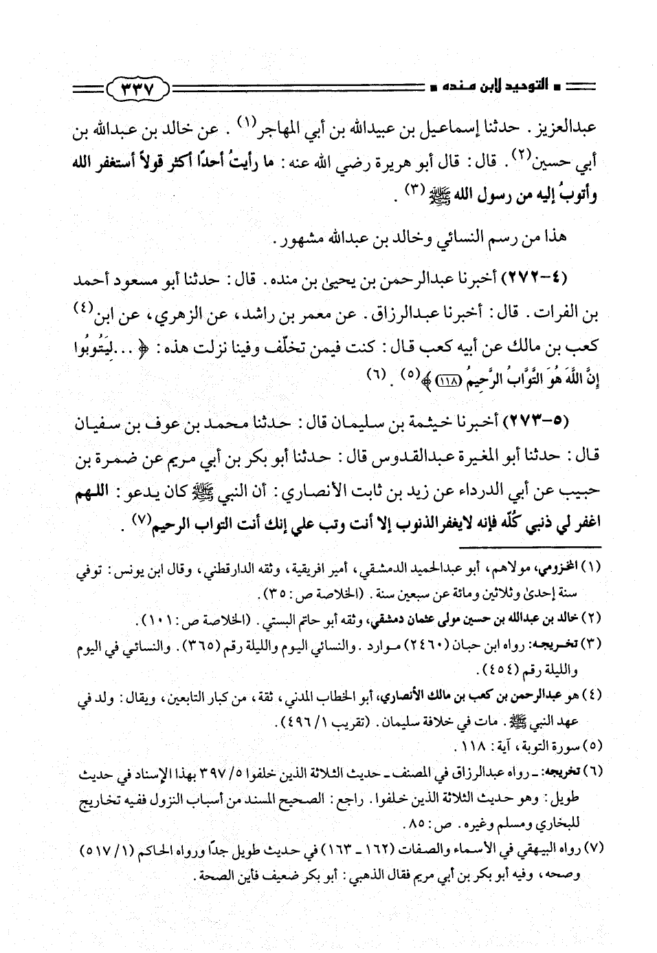 (٥ - ٢٧٣) أخبرنا خيثمة بن سليمان قال: حدثنا محمد بن عوف بن سفيان قال: حدثنا أبو المغيرة عبد القدوس قال: حدثنا أبو بكر بن أبى مريم عن ضمرة بن حبيب عن أبى الدرداء عن زيد بن ثابت الأنصارى: أن النبى صلّى الله عليه وسلم كان يدعو: اللهم اغفر لى ذنبى كُلّه فإنه لايغفر الذنوب إلا أنت وتب على إنك أنت التواب الرحيم (¬٧).