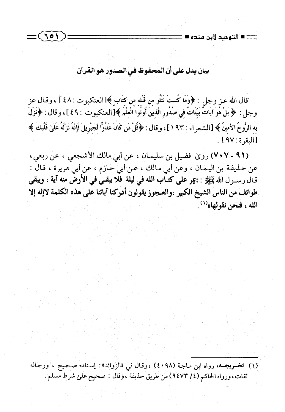 قال رسول الله صلّى الله عليه وسلم: «يمر على كتاب الله فى ليلة فلا يبقى فى الأرض منه آية، ويبقى طوائف من الناس الشيخ الكبير، والعجوز يقولون أدركنا آبائنا على هذه الكلمة لاإله إلا الله، فنحن نقولها» (¬١).