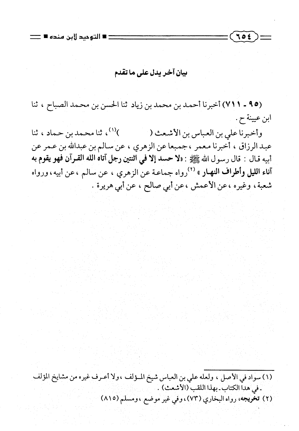 وأخبرنا على بن العباس بن الأشعث (. . .) (¬١)، ثنا محمد بن حماد، ثنا عبد الرزاق، أخبرنا معمر، جمبعا عن الزهرى، عن سالم بن عبد الله بن عمر عن أبيه قال: قال رسول الله صلّى الله عليه وسلم: «لا حسد إلا فى اثنتين رجل اتاه الله القرآن فهو يقوم به آناء الليل وأطراف النهار» (¬٢) رواه جماعة عن الزهرى، عن سالم، عن أبيه، ورواه شعبة، وغيره، عن الأعمش، عن أبى صالح، عن أبى هريرة.