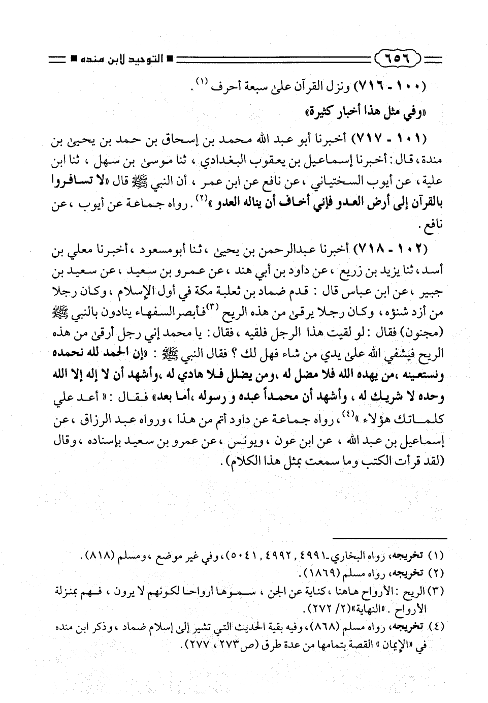 (¬٤) تخريجه، رواه مسلم (٨٦٨)، وفيه بقية الحديث التى تشير إلى إسلام ضماد، وذكر ابن منده فى «الايمان» القصة بتمامها من عدة طرق (ص ٢٧٣، ٢٧٧).