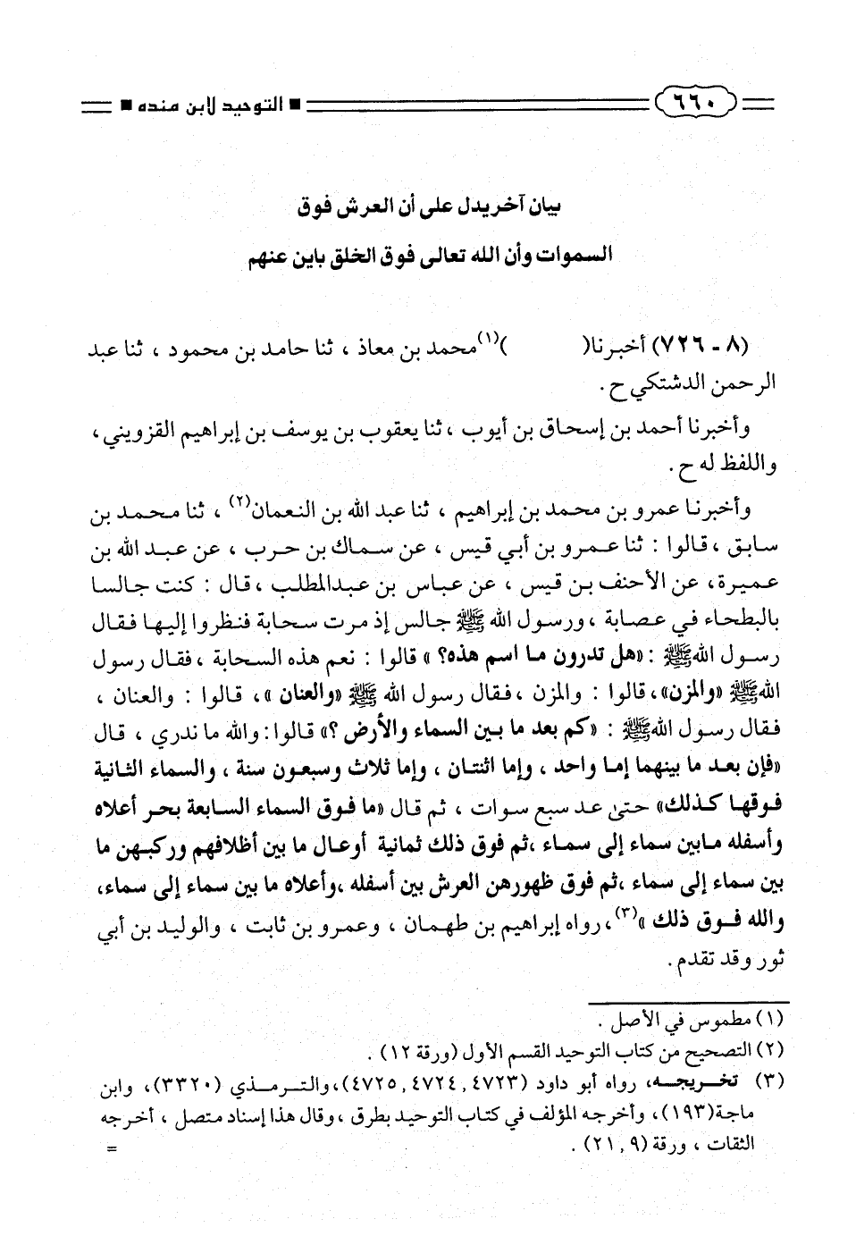 وأخبرنا عمرو بن محمد بن إبراهيم، ثنا عبد الله بن النعمان (¬٢)، ثنا محمد بن سابق، قالوا: ثنا عمرو بن أبى قيس، عن سماك بن حرب، عن عبد الله بن عميرة، عن الأحنف بن قيس، عن عباس بن عبد المطلب، قال: كنت جالسا بالبطحاء فى عصابة، ورسول الله صلّى الله عليه وسلم جالس إذ مرت سحابة فنظروا إليها فقال رسول الله صلّى الله عليه وسلم: «هل تدرون ما اسم هذه؟» قالوا: نعم هذه السحابة، فقال رسول الله صلّى الله عليه وسلم «والمزن»، قالوا: والمزن، فقال رسول الله صلّى الله عليه وسلم «والعنان»، قالوا: والعنان، فقال رسول الله صلّى الله عليه وسلم: «كم بعد ما بين السماء والأرض؟» قالوا: والله ما ندرى، قال «فإن بعد ما بينهما إما واحد، وإما اثنتان، وإما ثلاث وسبعون سنة، والسماء الثانية فوقها كذلك» حتى عد سبع سوات، ثم قال «ما فوق السماء السابعة بحر أعلاه وأسفله مابين سماء إلى سماء، ثم فوق ذلك ثمانية اوعال ما بين أظلافهم وركبهن ما بين سماء إلى سماء، ثم فوق ظهورهن العرش بين أسفله، وأعلاه ما بين سماء إلى سماء، والله فوق ذلك» (¬٣)، رواه إبراهيم بن طهمان، وعمرو بن ثابت، والوليد بن أبى ثور وقد تقدم.