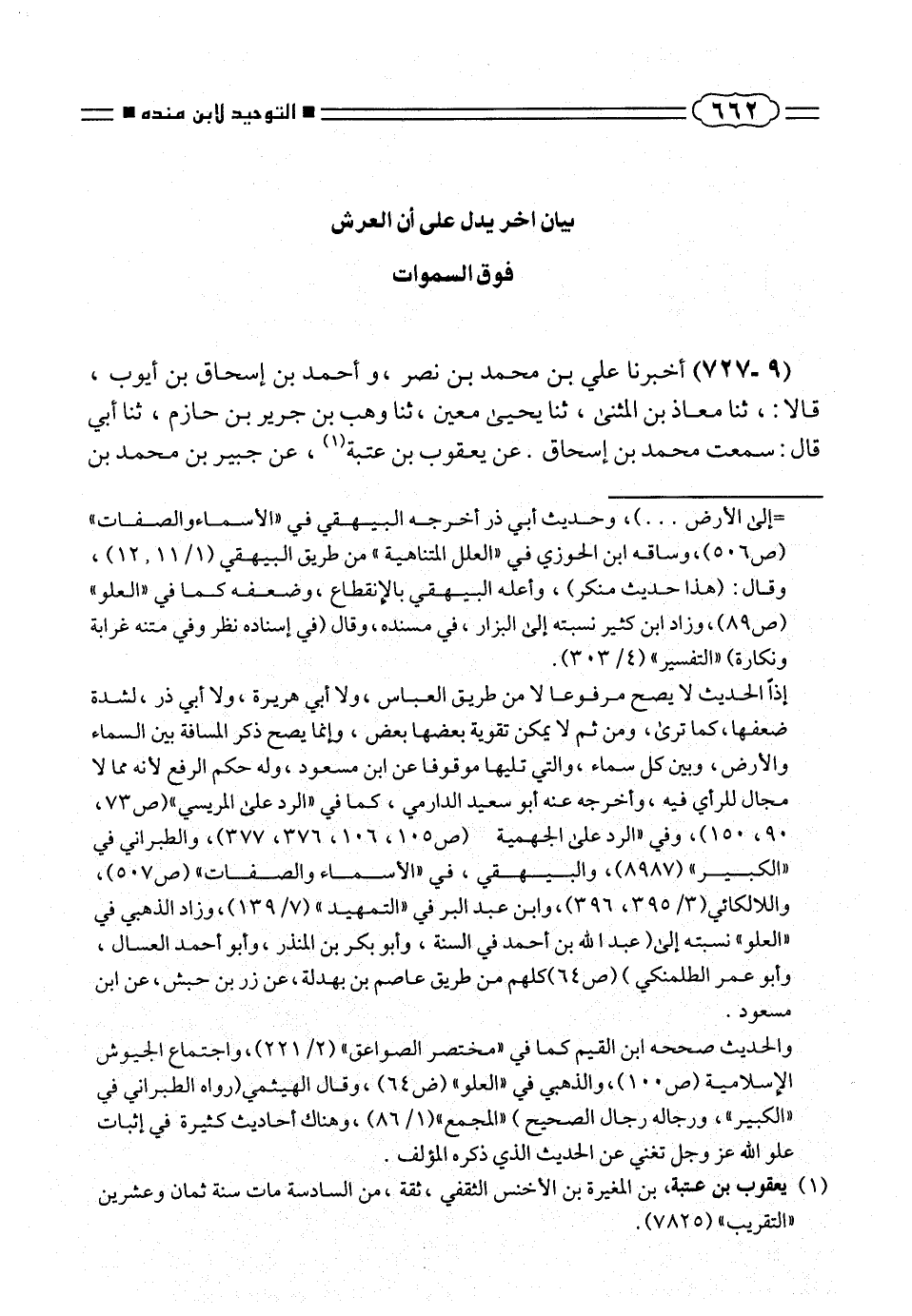 إذاً الحديث لا يصح مرفوعا لا من طريق العباس، ولا أبى هريرة، ولا أبى ذر، لشدة ضعفها، كما ترى، ومن ثم لا يمكن تقوية بعضها بعض، وإنما يصح ذكر المسافة بين السماء والأرض، وبين كل سماء، والتى تلبها موقوفا عن ابن مسعود، وله حكم الرفع لأنه مما لا مجال للرأى فيه، وأخرجه عنه أبو سعيد الدارمى، كما فى «الرد على المريسى» (ص ٧٣، ٩٠، ١٥٠)، وفى «الرد على الجهمية (ص ١٠٥، ١٠٦، ٣٧٦، ٣٧٧)، والطبرانى فى «الكبير» (٨٩٨٧)، والبيهقى، فى «الأسماء والصفات» (ص ٥٠٧)، واللالكائى (٣٩٥/ ٣، ٣٩٦)، وابن عبد البر فى «التمهيد» (١٣٩/ ٧)، وزاد الذهبى فى «العلو» نسبته إلى (عبد الله بن أحمد فى السنة، وأبو بكر بن المنذر، وأبو أحمد العسال، وأبو عمر الطلمنكى) (ص ٦٤) كلهم من طريق عاصم بن بهدلة، عن زر بن حبش، عن ابن مسعود.