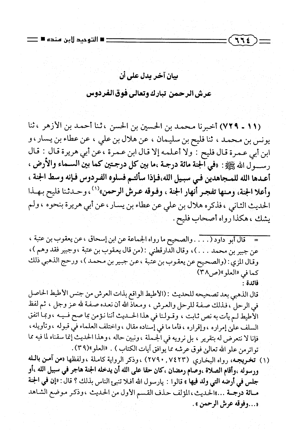 (¬١) تخريجه، رواه البخارى (٧٤٢٣، ٢٧٩٠)، وذكر الرواية كاملة، ولفظها «من آمن بالله ورسوله، وأقام الصلاة، وصام رمضان، كان حقا على الله أن يدخله الجنة هاجر فى سبيل الله، أو جلس فى أرضه التى رلد فيها» قالوا: يارسول الله أفلا تنبئ الناس بذلك؟ قال: «إن فى الجنة مائة درجة ... » الحديث، المؤلف حذف القسم الأول من الحديث، وذكر موضع الشاهد « ... وفوقه عرش الرحمن».