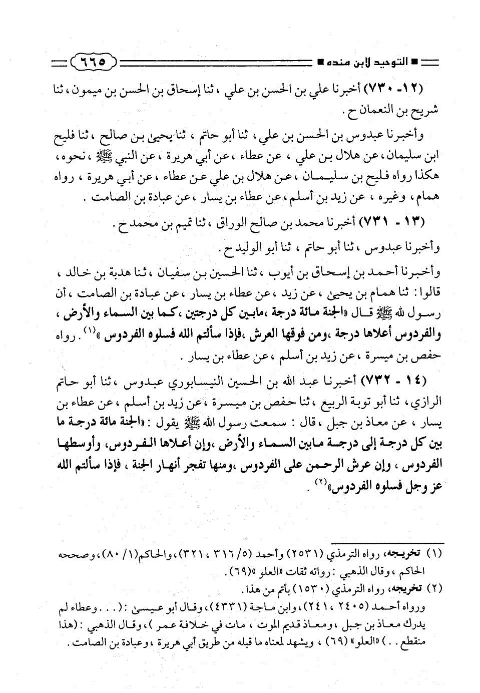 (١٤ - ٧٣٢) أخبرنا عبد الله بن الحسين النيسابورى عبدوس، ثنا أبو حاتم الرازى، ثنا أبو توبة الربيع، ثنا حفص بن ميسرة، عن زيد بن أسلم، عن عطاء بن يسار، عن معاذ بن جبل، قال: سمعت رسول الله صلّى الله عليه وسلم يقول: «الجنة مائة درجة ما بين كل درجة إلى درجة مابين السماء والأرض، وإن أعلاها الفردوس، وأوسطها الفردوس، وإن عرش الرحمن على الفردوس، ومنها تفجر أنهار الجنة، فإذا سألتم الله عز وجل فسلوه الفردوس» (¬٢).