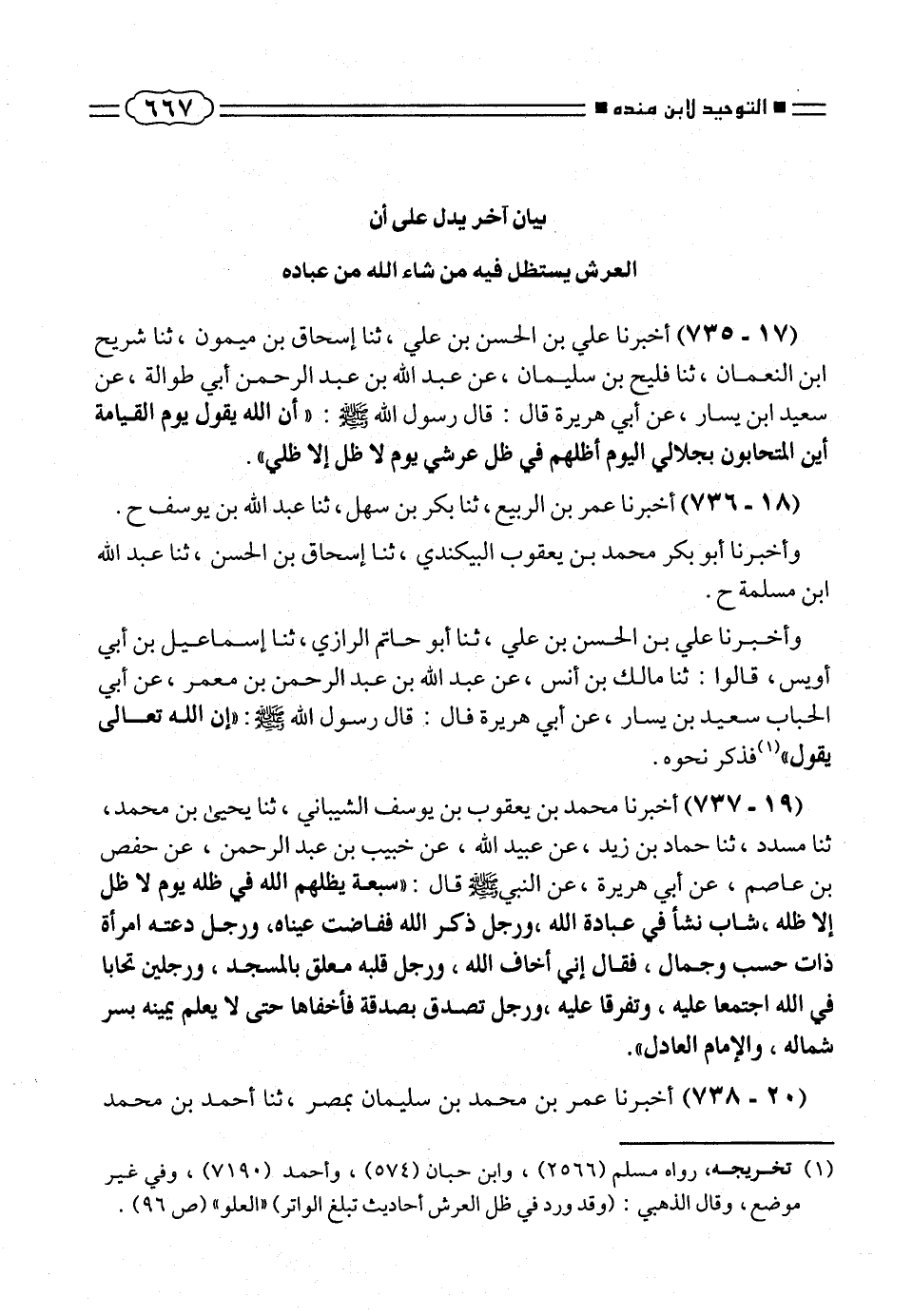 (¬١) تخريجه، رواه مسلم (٢٥٦٦)، وابن حبان (٥٧٤)، وأحمد (٧١٩٠)، وفى غير موضع، وقال الذهبى: (وقد ورد فى ظل العرش أحاديث تبلغ الواتر) «العلو» (ص ٩٦).