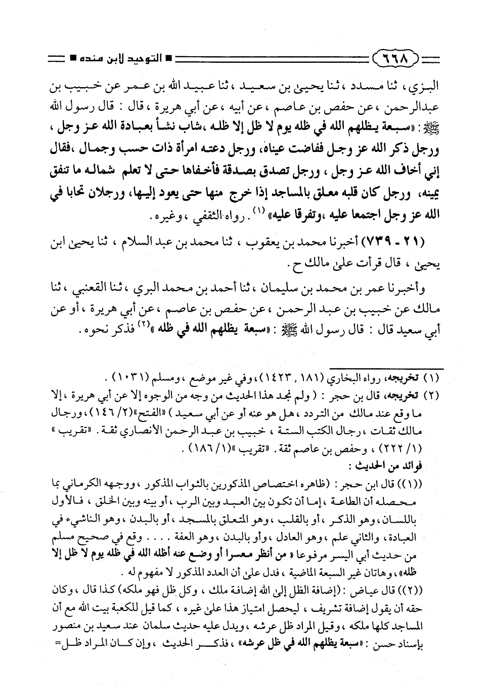 البزى، ثنا مسدد، ثنا يحيى بن سعيد، ثنا عبيد الله بن عمر عن خبيب بن عبد الرحمن، عن حفص بن عاصم، عن أبيه، عن أبى هريرة، قال: قال رسول الله صلّى الله عليه وسلم: «سبعة يظلهم الله فى ظله يوم لا ظل إلا ظله، شاب نشاء بعبادة الله عز رجل، ورجل ذكر الله عز وجل ففاضت عيناه، ورجل دعته امرأة ذات حسب وجمال، فقال إنى أخاف الله عز وجل، ورجل تصدق بصدقة فأخفاها حتى لا تعلم شماله ما تنفق يمينه، ورجل كان قلبه معلق بالمساجد إذا خرج منها حتى يعود إليها، ورجلان تحابا فى الله عز وجل اجتمعا عليه، وتفرقا عليه» (¬١). رواه الثقفى، وغيره.