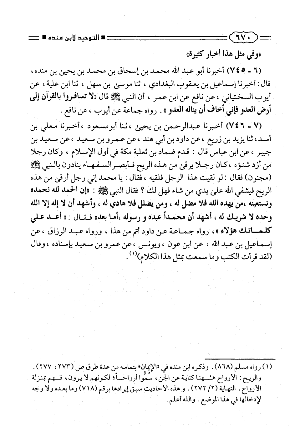 «وفى مثل هذا أخبار كثيرة» (٦ - ٧٤٥) أخبرنا أبو عبد الله محمد بن إسحاق بن محمد بن يحيى بن منده، قال: أخبرنا إسماعيل بن يعقوب البغدادى، ثنا موسى بن سهل، ثنا ابن علية، عن أيوب السختيانى، عن نافع عن ابن عمر، أن النبى صلّى الله عليه وسلم قال «لا تسافروا بالقرآن ألى أرض العدو فإنى أخاف أن يناله العدو». رواه جماعة عن أيوب، عن نافع.