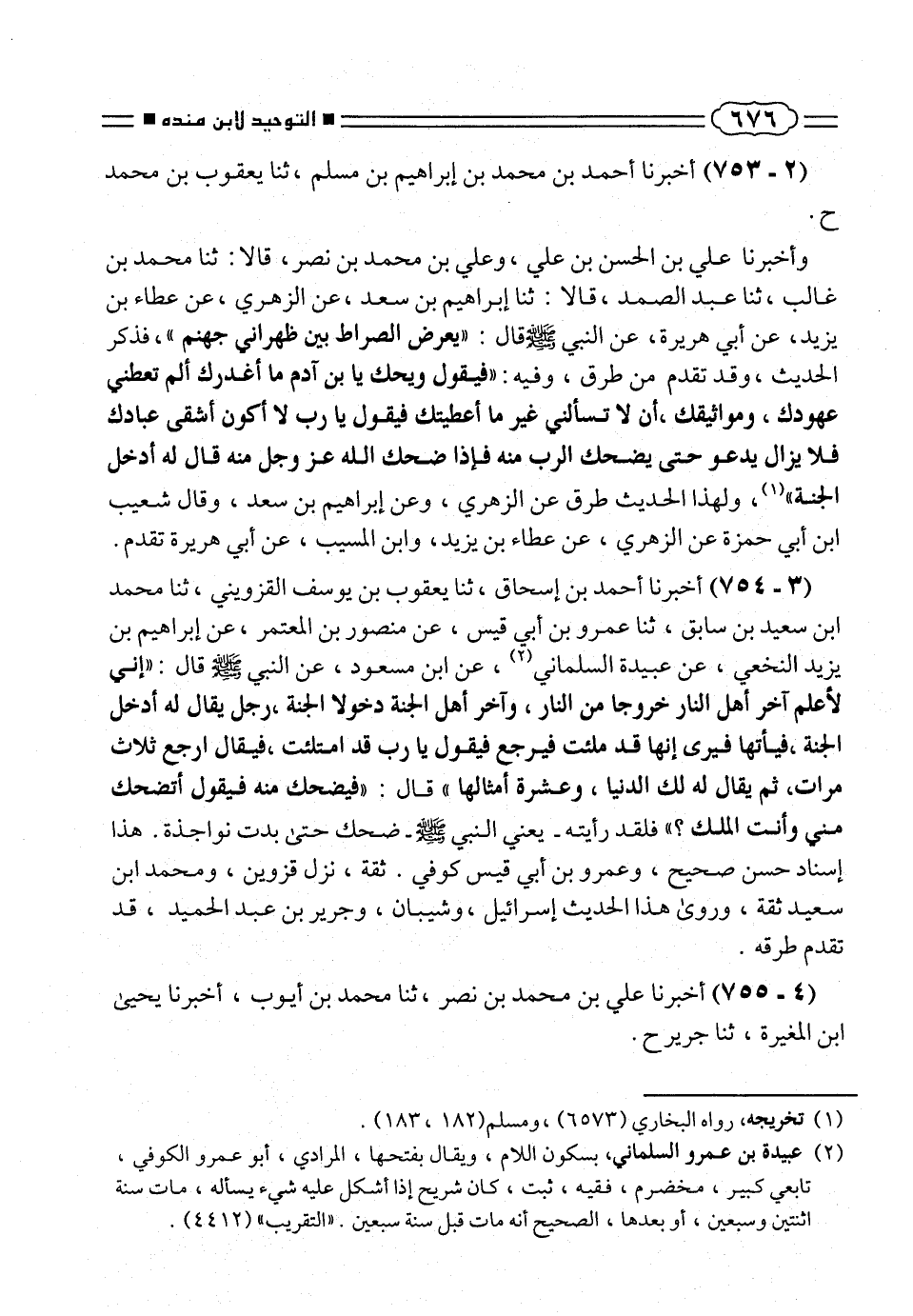 (٣ - ٧٥٤) أخبرنا أحمد بن إسحاق، ثنا يعقوب بن يوسف القزوينى، ثنا محمد ابن سعيد بن سابق، ثنا عمرو بن أبى قيس، عن منصور بن المعتمر، عن إبراهيم بن يزيد النخعى، عن عبيدة السلمانى (¬٢)، عن ابن مسعود، عن النبى صلّى الله عليه وسلم قال: «إنى لأعلم آخر أهل النار خروجا من النار، وآخر أهل الجنة دخولا الجنة، رجل يقال له أدخل الجنة، فيأتها فيرى إنها قد ملئت فيرجع فيقول يا رب قد امتلئت، فيقال ارجع ثلاث مرات، ثم يقال له لك الدنيا، وعشرة أمثالها» قال: «فيضحك منه فيقول أتضحك منى وأنت الملك؟» فلقد رأيته - يعنى النبى صلّى الله عليه وسلم - ضحك حتى بدت نواجذة. هذا إسناد حسن صحيح، وعمرو بن أبى قيس كوفى. ثقة، نزل قزوين، ومحمد ابن سعيد ثقة، وروى هذا الحديث إسرائيل، وشيبان، وجرير بن عبد الحميد، قد تقدم طرقه.