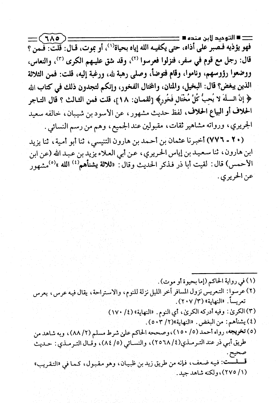 فهو يوذيه فصبر على آذاه، حتى يكفيه الله اياه بحياة، (¬١) او بموت، قال: قلت: فمن؟ قالَ: رجل مع قَوم فى سفر، فنزلوا فعرسوا (¬٢)، وقد شق عليهم الكرى (¬٣)، والنعاس، ووضعوا رؤوسهم، وناموا، وقام فتوضأ، وصلى رهبة لله، ورغبة إليه، قلت: فمن الثلاثة الذين يبغض؟ قال: البخيل، والمنان، والمختال الفخور، وإنكم لتجدون ذلك فى كتاب الله {إِنَّ اللهَ لا يُحِبُّ كُلَّ مُخْتالٍ فَخُورٍ} [لقمان: ١٨]، قلت فمن الثالث؟ قال التاجر الحلاف أو البياع الحلاف، لفظ حديث مشهور، عن الأسود بن شيبان، خالفه سعيد الجريرى، ورواته مشاهير ثقات، مقبولين عند الجميع، وهم من رسم النسائى.