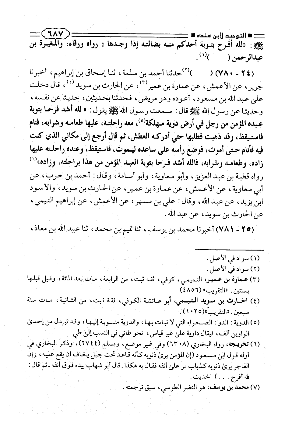 (٢٤ - ٧٨٠) (. . .) (¬٢) حدثنا أحمد بن سلمة، ثنا إسحاق بن إبراهيم، أخبرنا جرير، عن الأعمش، عن عمارة بن عمير (¬٣)، عن الحارث بن سويد (¬٤)، قال دخلت على عبد الله بن مسعود، أعوده وهو مريض، فحدثنا بحديثين، حديثا عن نفسه، وحديثا عن رسول الله صلّى الله عليه وسلم قال: سمعت رسول الله صلّى الله عليه وسلم. يقول: «لله أشد فرحا بتوبة عبده المؤمن من رجل فى أرض دوية مهلكة (¬٥)، معه راحلته، عليها طعامه وشرابه، فنام فاستيقظ، وقد ذهبت فطلبها حتى أدركه العطش، ثم قال أرجع إلى مكانى الذى كنت فيه فأنام حتى أموت، فوضع رأسه على ساعده ليموت، فاستيقظ، وعنده راحلته عليها زاده، وطعامه وشرابه، فالله أشد فرحا بتوبة العبد المؤمن من هذا براحلته، وزاده» (¬٦) رواه قطبة بن عبد العزيز، وأبو معاوية، وأبو أسامة، وقال: أحمد بن حرب، عن أبى معاوية، عن الأعمش، عن عمارة بن عمير، عن الحارث بن سويد، والأسود ابن يزيد، عن عبد الله، وقال: على بن مسهر، عن الأعمش، عن إبراهيم التيمى، عن الحارث بن سويد، عن عبد الله.