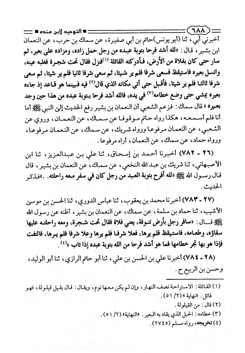 (٢٧ - ٧٨٣) أخبرنا محمد بن يعقوب، ثنا عباس الدورى، ثنا الحسن بن موسى الأشيب، ثنا حماد بن سلمة، عن سماك، عن النعمان بن بشير، أظنه عن رسول الله صلّى الله عليه وسلم قال: «سافر رجل بأرض تنوفة، يعنى فلاة فقال تحت شجرة، ومعه راحلته عليها سقاؤه، وطعامه، فاستيقظ فلم يرها، فعلا شرفا فلم يرها وعلا شرفا فلم يرها، فالتفت فإذا هو بها تجر خطامها فما هو أشد فرحا من الله بتوبة عبده إذا تاب» (¬٤).