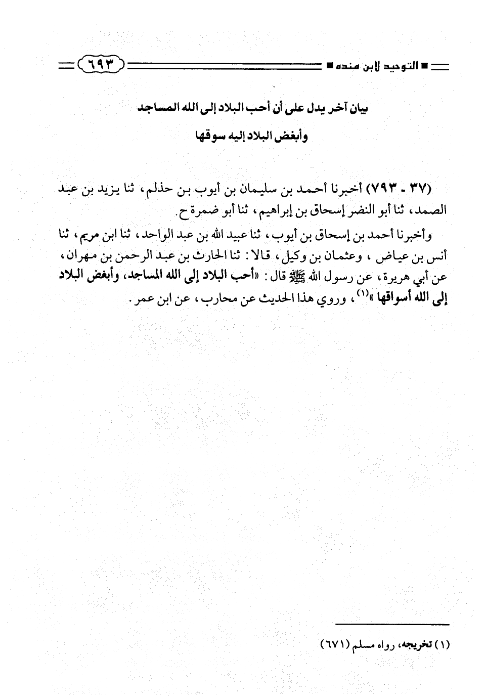 وأخبرنا أحمد بن إسحاق بن أيوب، ثنا عبيد الله بن عبد الواحد، ثنا ابن مريم، ثنا أنس بن عياض، وعثمان بن وكيل، قالا: ثنا الحارث بن عبد الرحمن بن مهران، عن أبى هريرهَ، عن رسول الله صلّى الله عليه وسلم قال: «أحب البلاد إلى الله المساجد، وأبغض البلاد إلى الله أسواقها» (¬١)، وروى هذا الحديث عن محارب، عن ابن عمر.