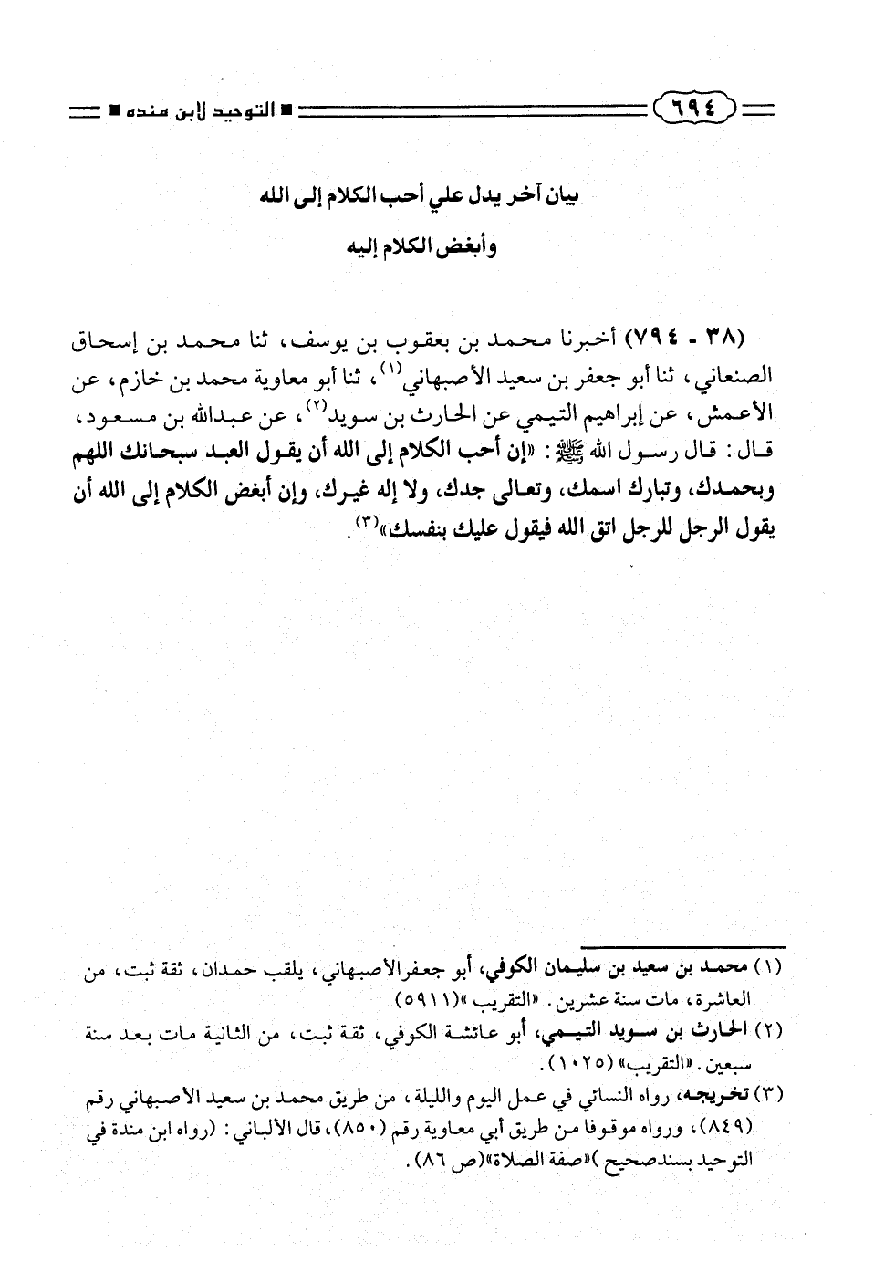 (٣٨ - ٧٩٤) أخبرنا محمد بن بعقوب بن يوسف، ثنا محمد بن إسحاق الصنعانى، ثنا أبو جعفر بن سعيد الأصبهانى (¬١)، ثنا أبو معاوية محمد بن خازم، عن الأعمش، عن إبراهيم التيمى عن الحارث بن سويد (¬٢)، عن عبد الله بن مسعود، قال: قال رسول الله صلّى الله عليه وسلم: «إن أحب الكلام إلى الله أن يقول العبد سبحانك اللهم وبحمدك، وتبارك اسمك، وتعالى جدك، ولا إله غيرك، وإن أبغض الكلام إلى الله أن يقول الرجل للرجل اتق الله فيقول عليك بنفسك» (¬٣).