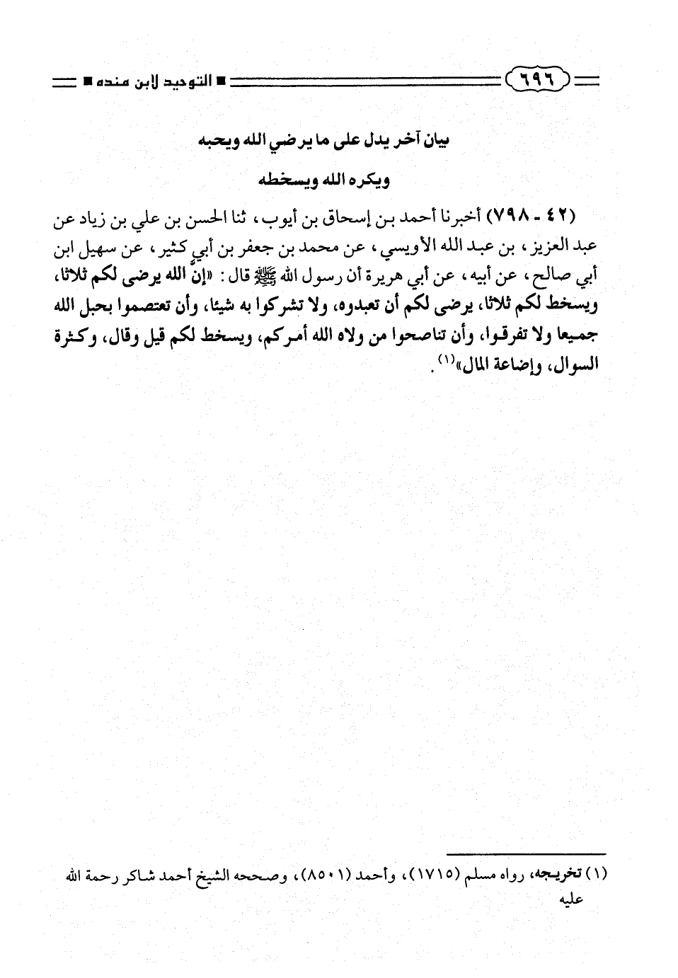 (٤٢ - ٧٩٨) أخبرنا أحمد بن إسحاق بن أيوب، ثنا الحسن بن على بن زياد عن عبد العزيز، بن عبد الله الأويسى، عن محمد بن جعفر بن أبى كثير، عن سهيل ابن أبى صالح، عن أبيه، عن أبى هريرة أن رسول الله صلّى الله عليه وسلم قال: «إنَّ الله يرضى لكم ثلاثا، ويسخط لكم ثلاثا، يرضى لكم أن تعبدوه، ولا تشركوا به شيئا، وأن تعتصموا بحبل الله جميعا ولا تفرقوا، وأن تناصحوا من ولاه الله أمركم، ويسخط لكم قيل وقال، وكثرة السوال، وإضاعة المال» (¬١).