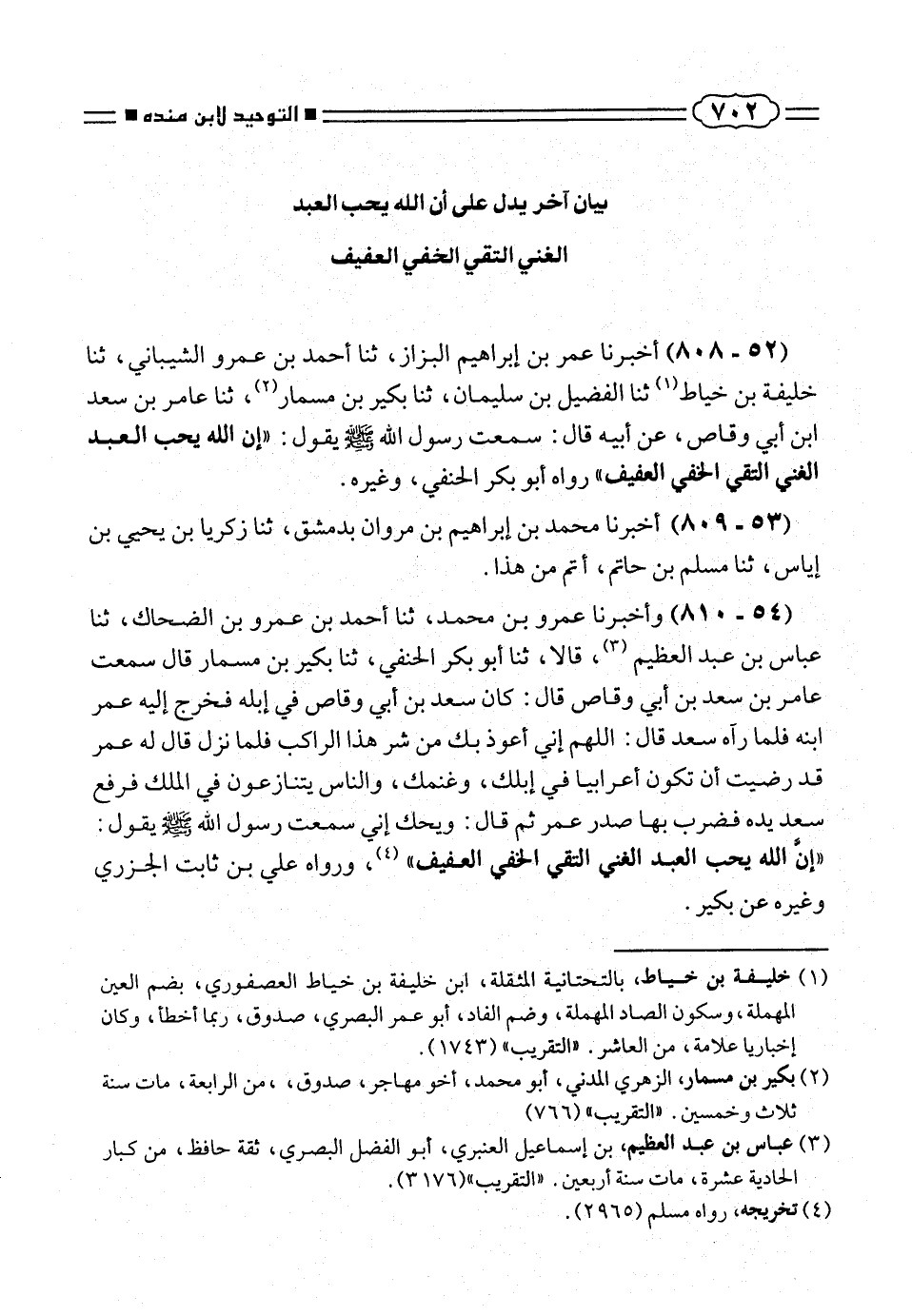 (٥٢ - ٨٠٨) أخبرنا عمر بن إبراهيم البزاز، ثنا أحمد بن عمرو الشيبانى، ثنا خليفة بن خياط (¬١) ثنا الفضيل بن سليمان، ثنا بكير بن مسمار (¬٢)، ثنا عامر بن سعد ابن أبى وقاص، عن أبيه قال: سمعت رسول الله صلّى الله عليه وسلم يقول: «إن الله يحب العبد الغنى التقى الخفى العفيف» رواه أبو بكر الحنفى، وغيره.