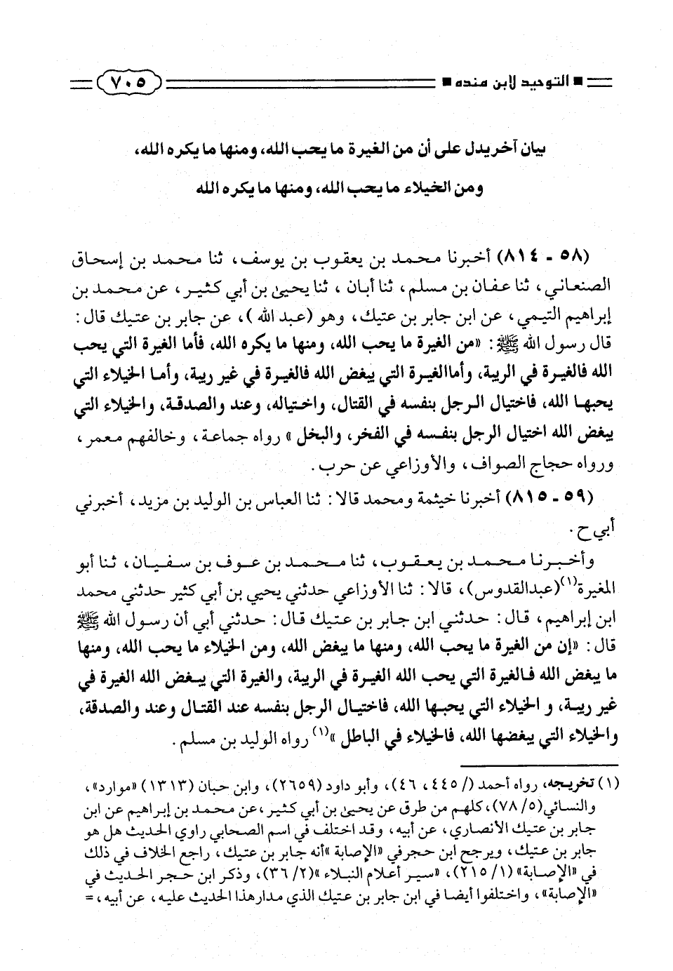 وأخبرنا محمد بن يعقوب، ثنا محمد بن عوف بن سفيان، ثنا أبو المغيرة (¬١) (عبدالقدوس)، قا لا: ثنا الأوزاعى حدثنى يحيى بن أبى كثير حدثنى محمد ابن إبراهيم، قال: حدثنى ابن جابر بن عتيك قال: حدثنى أبى أن رسول الله صلّى الله عليه وسلم قال: «إن من الغيرة ما يحب الله، ومنها ما يبغض الله، ومن الخيلأ ما يحب الله، ومنها ما يبغض الله فالغيرة التى يحب الله الغيرة فى الردبية، والغيرة التى يبغض الله الغيرة فى غير ريبة، والخيلاء التى يحبها الله، فاختيال الرجل بنفسه عند القتال وعند والصدقة، والخيلاء التى يبغضها الله، فالخيلاء فى الباطل» (¬١) رواه الوليد بن مسلم.