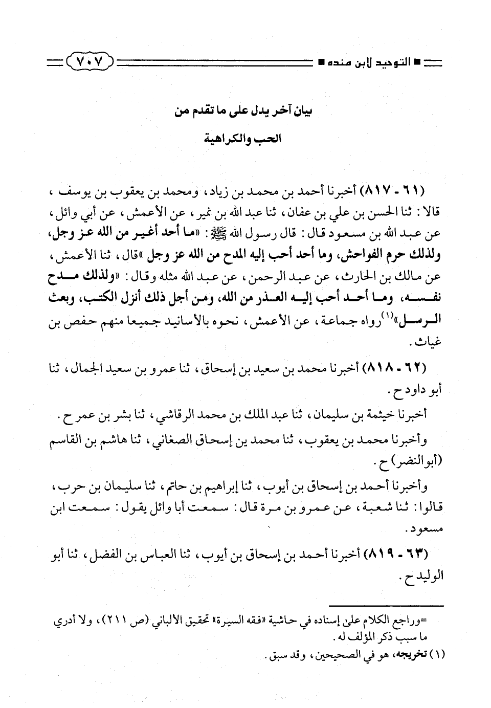 (٦١ - ٨١٧) أخبرنا أحمد بن محمد بن زياد، ومحمد بن يعقوب بن يوسف، قالا: ثنا الحسن بن على بن عفان، ثنا عبد الله بن نمير، عن الأعمش، عن أبى وائل، عن عبد الله بن مسعود قال: قال رسول الله صلّى الله عليه وسلم: «ما أحد أغير من الله عز وجل، ولذلك حرم الفواحش، وما أحد أحب إليه المدح من الله عز وجل» قال، ثنا الأعمش، عن مالك بن الحارث، عن عبد الرحمن، عن عبد الله مثله وقال: «ولذلك مدح نفسه، وما أحد أحب إليه العذر من الله، ومن أجل ذلك أنزل الكتب، وبعث الرسل» (¬١) رواه جماعة، عن الأعمش، نحوه بالأسانيد جميعا منهم حفص بن غياث.