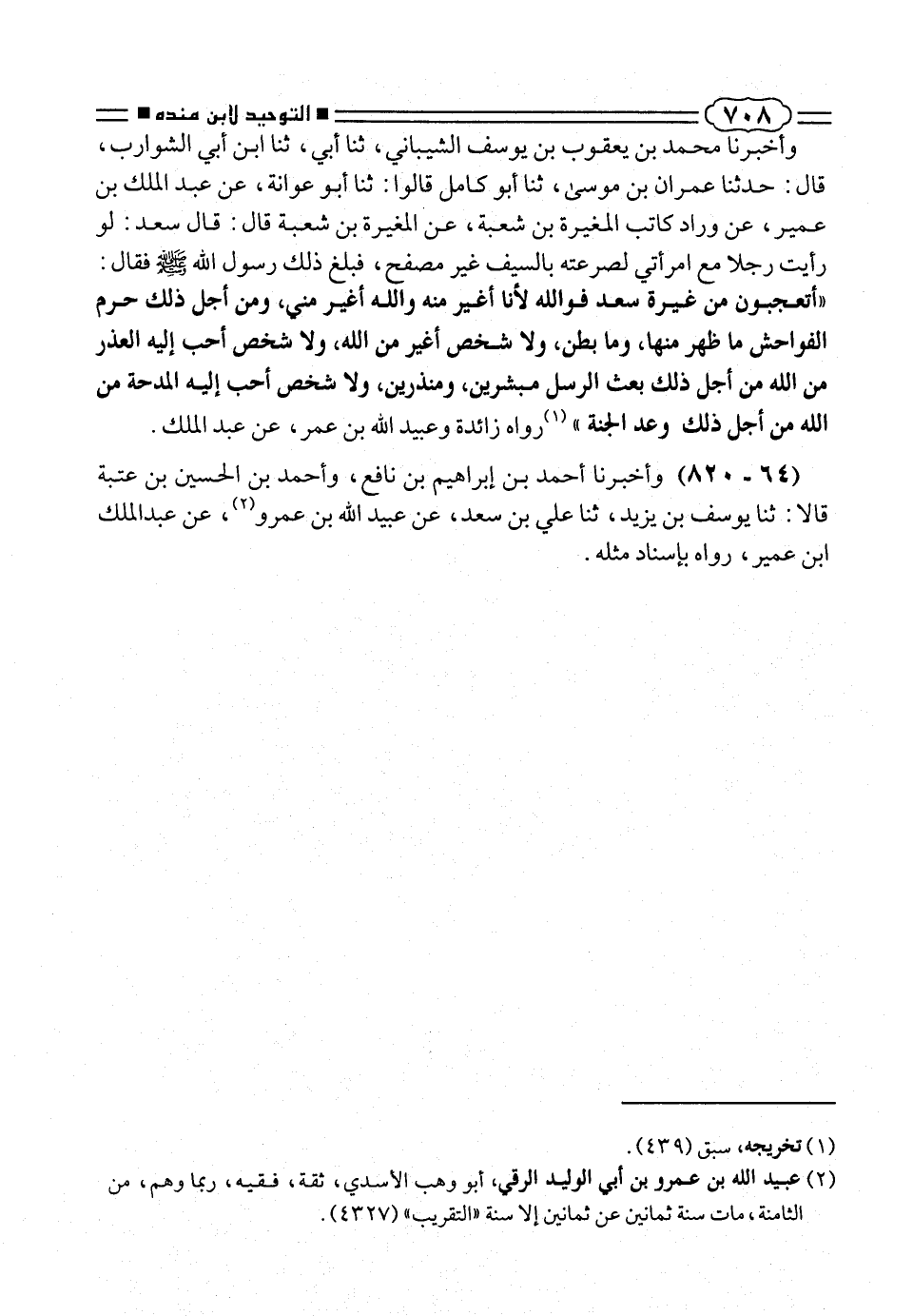 وأخبرنا محمد بن يعقوب بن يوسف الشيبانى، ثنا ابى، ثنا ابن أبى الشوارب، قال: حدثنا عمران بن موسى، ثنا أبو كامل قالوا: ثنا أبو عوانة، عن عبد الملك بن عمير، عن وراد كاتب المغيرة بن شعبة، عن المغيرة بن شعبة قال: قال سعد: لو رأيت رجلا مع امرأتى لصرعته بالسيف غير مصفح، فبلغ ذلك رسول الله صلّى الله عليه وسلم فقال:
